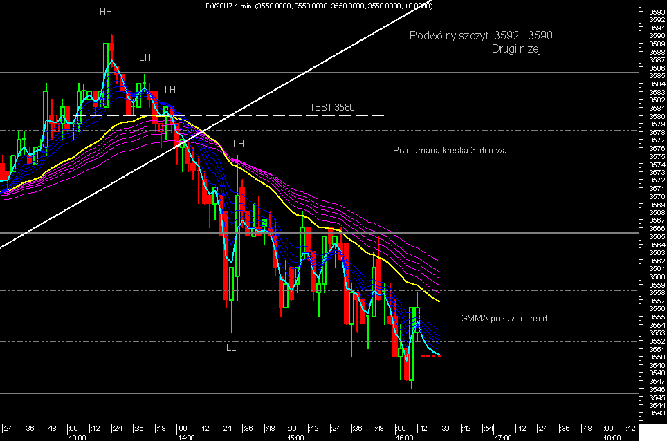 Widać wyraźnie, że LH a następnie LL w połączeniu z innymi wskaźnikami takimi jak GMMA czy linią trendu sygnalizują zmiane trendu. Analogicznie przy zmianie trendu ze spadkowego na wzrostowy mamy HL, a następnie HH.