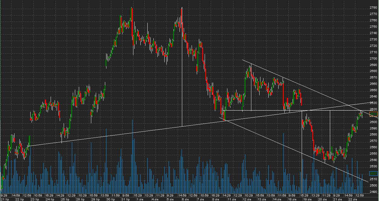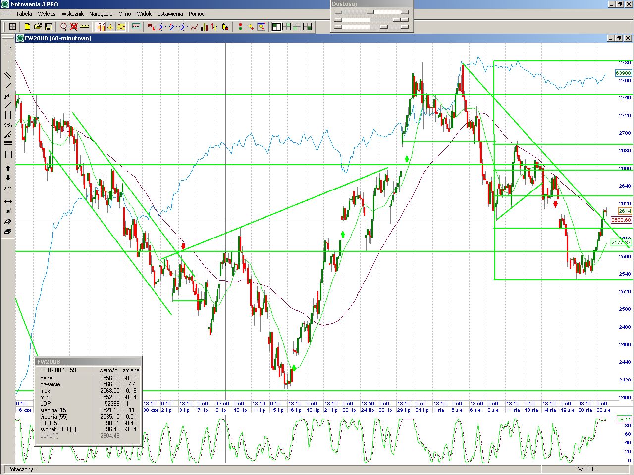 Pojawiły sie pierwsze oznaki slabosci misia. Pokonano srednia 15 ma i na intra mamy wstepny sygnal kupna. Do tego obrona fiba 68% . Gdybysmy dzisiaj pokonali poziom 2580 , gdzie znajduje sie polowa czarnej swiecy bylby to dogodny moment na atak na linie trendu spadkowego teraz ok. 2610. Na day 2 szpulki , w polaczeniu z opisana sytuacja intra byki nie stoja na straconej pozycji. Byc moze baza wspomoze strone kupujaca.