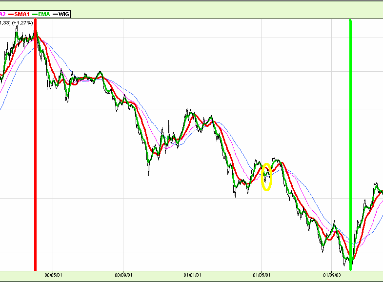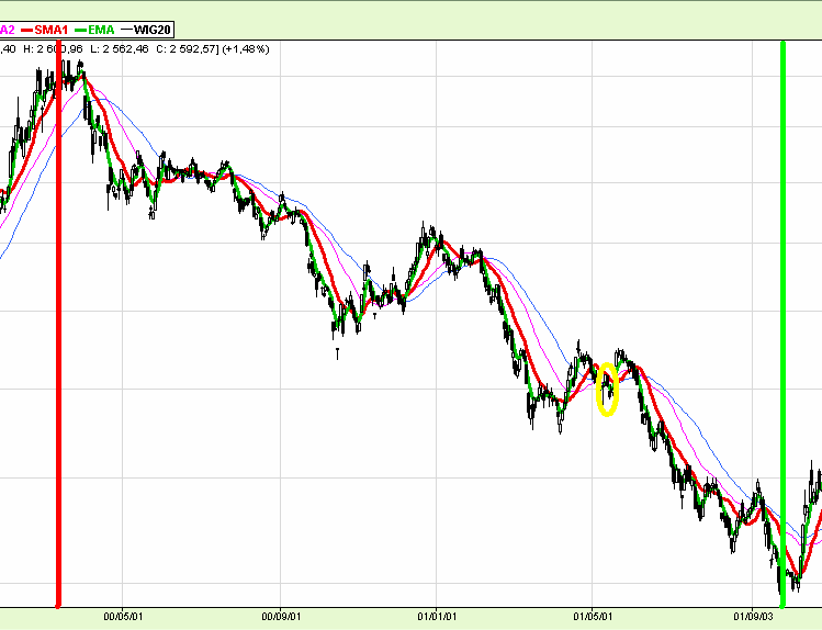 Kolorem żółtym zostało oznaczone miejsce w bessie III 2000 - X 2001, które może odpowiadać zaawansowaniu obecnej bessy.