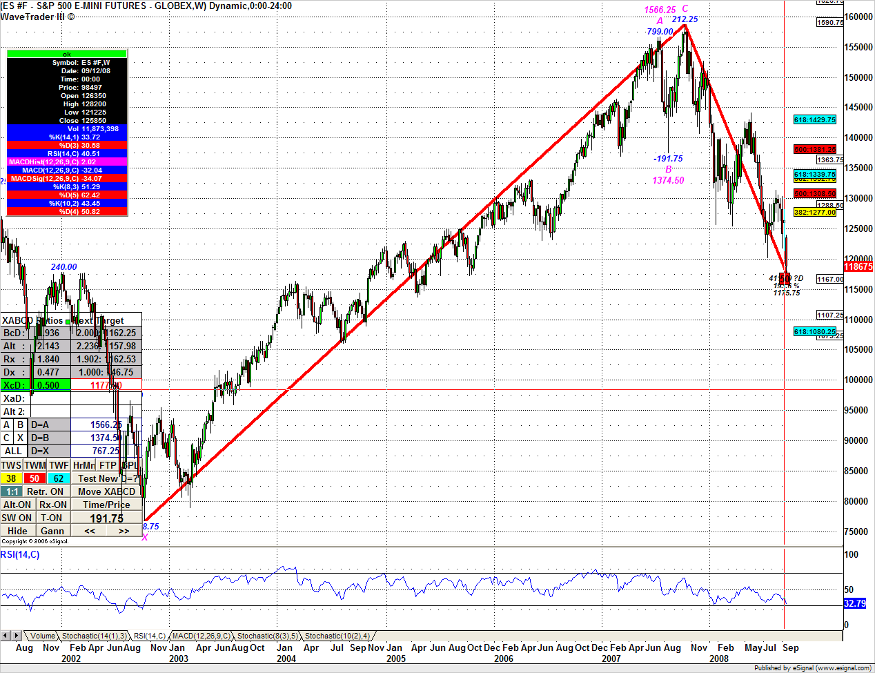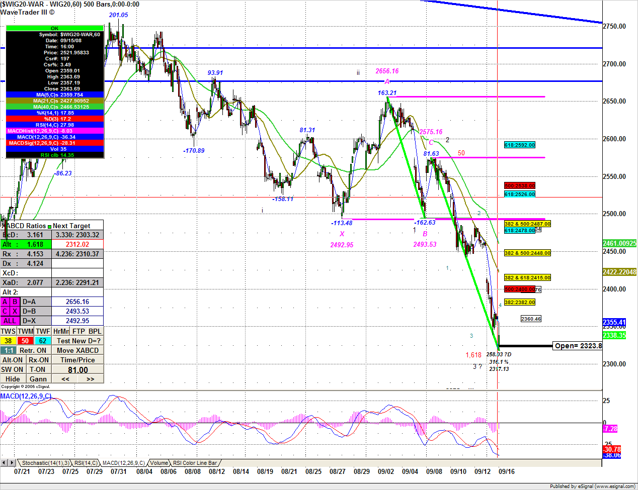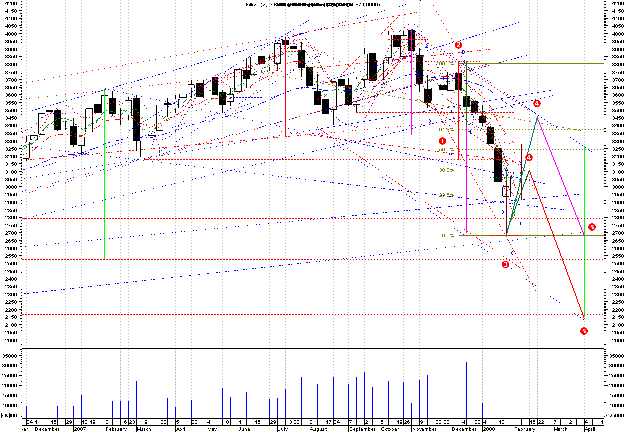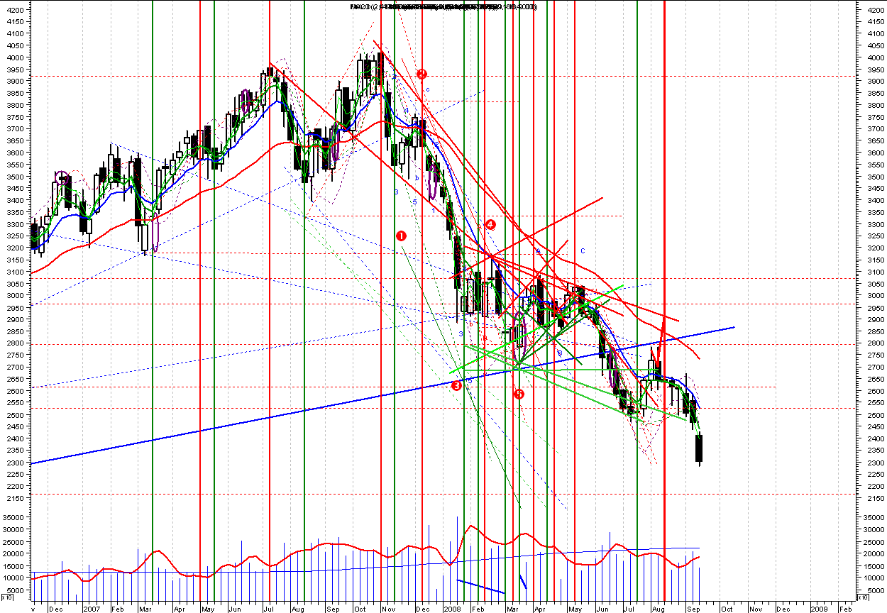 Po lekkiej korekcie najniższej paraboli (wykluł się nowy punkt wsparcia) + czasówki, przy zachowaniu 3,5 letniego cyklu (ale mającego wyraźne echa min i max nawet od września 2001) - prognozowałbym jeden z dwóch zaznaczonych punktów docelowych 2213 albo 2050.