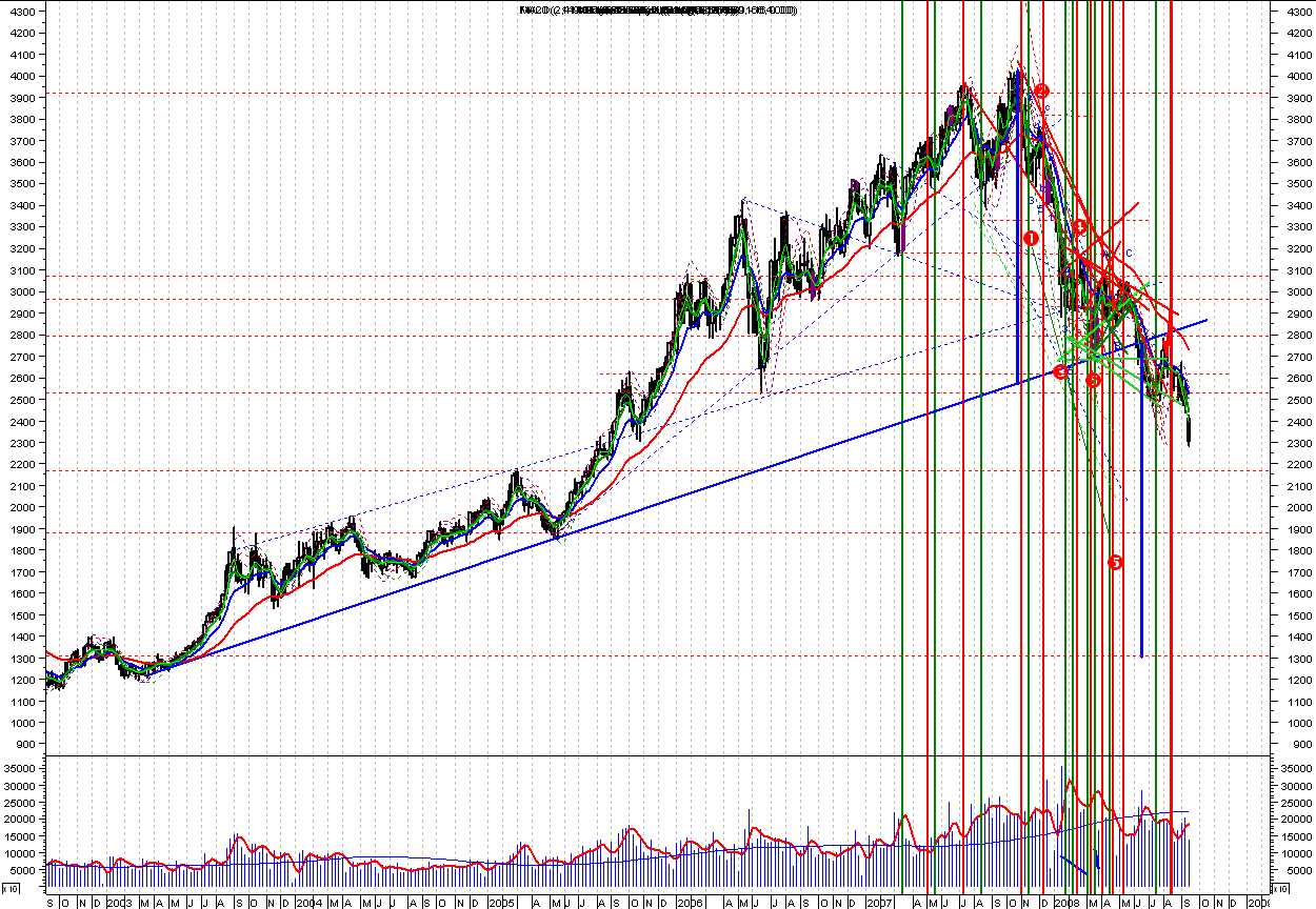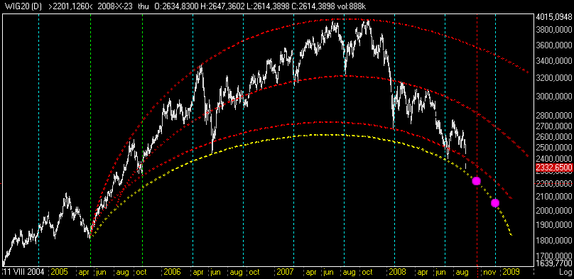 skippy napisał(a):Po lekkiej korekcie najniższej paraboli (wykluł się nowy punkt wsparcia) + czasówki, przy zachowaniu 3,5 letniego cyklu (ale mającego wyraźne echa min i max nawet od września 2001) - prognozowałbym jeden z dwóch zaznaczonych punktów docelowych 2213 albo 2050.