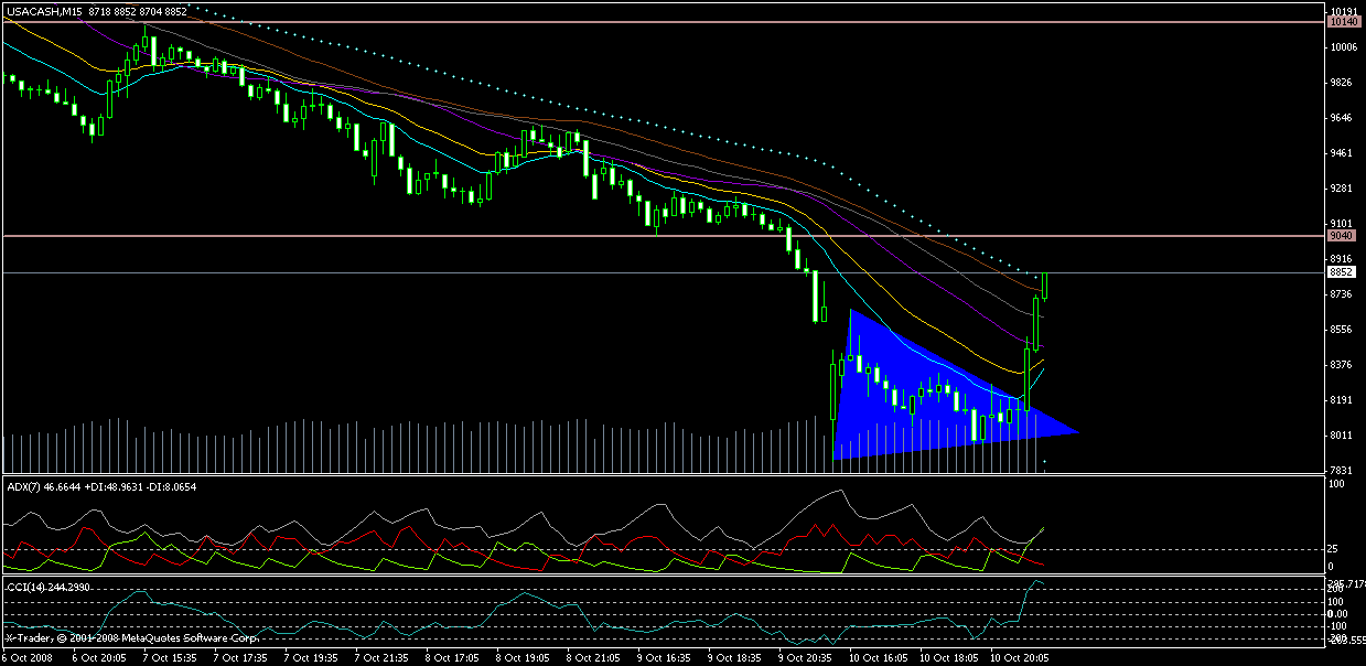 Mamy na DJIA czarna swiece z malym korpusem i dlugim dolnym cieniem wiec szansa na wzrosty jest bardzo duza.Poza tym po spadku DJIA o 30% odreagowanie jest niemal pewne.W poniedzialem RSI bedzie mial szanse wygenerowac sygnal zakupu.Ponadto indeks przebil EMA 13 34 i 55 na interwale 15 min co sie dawno nie zdarzylo wiec z punktu widzenia AT powinnismy miec silne odbicie.