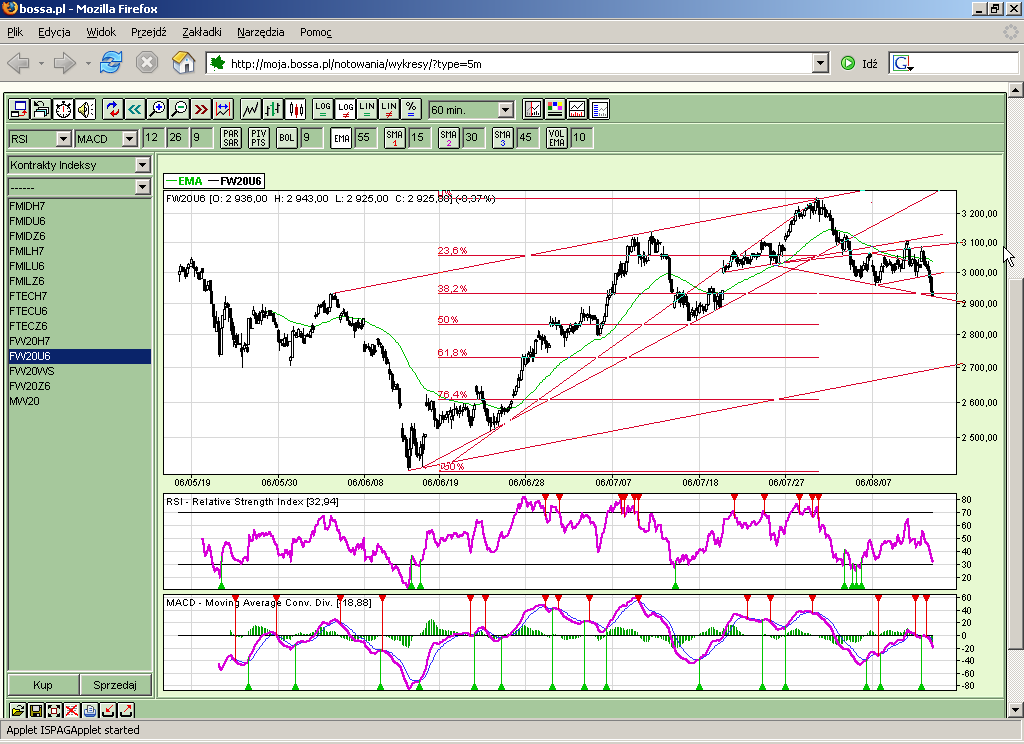 Na wykresie week czarna Âwieca potwierdza trend spadkowy-zasiŕg 2500 pkt, na wykresie day potwierdzone 3 czarne kruki oraz negatywna dywergencja 2 stopnia na rsi. Wykres prze?amania 3 linii potwierdzil sygna? s i ostrozniejsi gracze mog? ju? smia?o otwieraŠ pozycje ss. Piatkowa sesja mo?e sk?onic wielu graczy Ârdnioterminowych do otwarcia pozycji ss, kolejnym punktem dla miskˇw jest spory obrˇt na ostatniej sesji. Prze?amane wsparcie na poziomie 2957 pkt - w poniedzia?ek mo?liwy powrˇt i to dobry moment do otwaria ss. Sam niestety te? jestem zmŕczony ostanim tygodniem i nie wytrzyma?em z skami do ko˝ca pi?tkowej sesji, ale nic straconego spadki dopiero przed nami a zasieg conajmniej 2500 daje du?y potencja? spadkowy. Kolejne negatywne czynniki to wykresy spˇlek wig20 : pkn spadek do 45, tpsa, pko i pko bp wyra?ny spadek poni?ej ostaniego szczytu i mo?liwy 2 szczyt. Zachŕcam do przeczytania analizy kghm QUEBY pod fkghm - du?e prawdopodobienstwo tego scenariusza. Kolejne zagro?enia to spadki na rynku miedzi i ropy. To tyle analize fal oraz wykresu intra pozostawiam oinnym ''forumowiczom''.