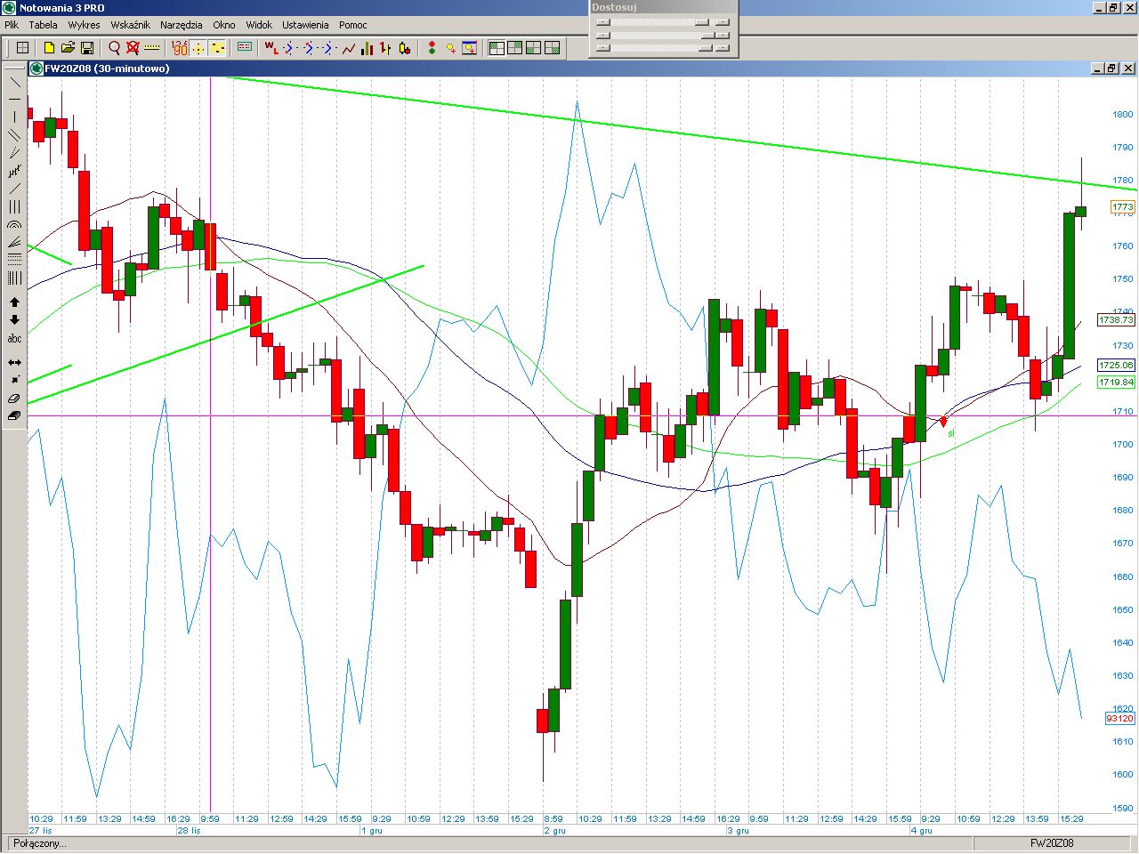 ps.kilka słów wyjaśnienia.......ponieważ w systemie stosuje dwa rodzaje stopów wyniki mogą być różne.........stop ruchomy wynika ze średnich, stop sztywny zwykle jak opisałem ustawiam 5 pkt powyżej najdłuższej średniej, jeśli kurs znacznie się od niej oddali przesuwam go 5 pkt powyżej środkowej średniej stąd zmiana dziś z 1685 na 1705........pewnie teraz wpadliśmy w bok więc system troche zgłupiał..........poczekałbym jednak na wybicie z trójkąta i przez ten czas ostrożnie traktowałbym sygnały systemu , który jest wybitnie trendowy:)))))))))