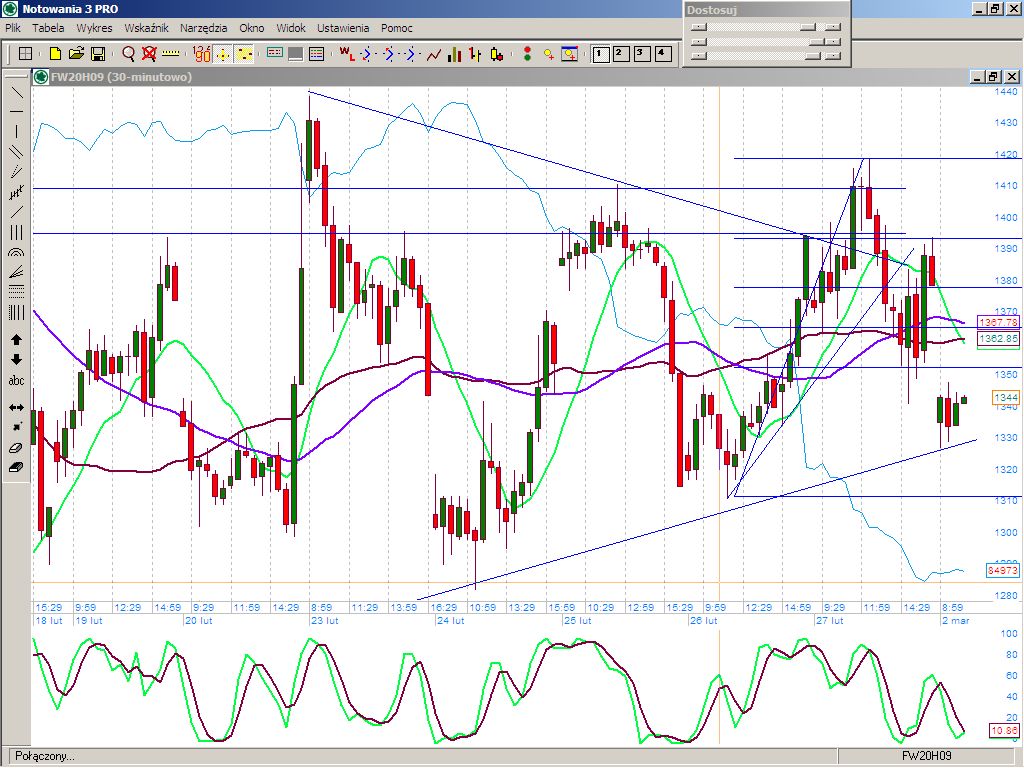 wraz z publikacją sygnałów samoistnie pojawił się filtr. W systemie w trendzie bocznym ''rozjeżdżają '' się średnie tj. są splecione krótka,średnia , długa i stąd ostatnio błędne sygnały. Teraz już mądrzejszy o ten filtr będę publikowal sygnał tylko w wypadku prawidłowego ułożenia średnich. Obecnie średnia środkowa i najdłuższa splotły się jak warkocz, co oznacza trend boczny (widoczny na sreenie sygnał jest zapewne błędny), w którym system nie działa. Należy poczekać na wybicie, rozjechanie się średnich po czym nastąpi właściwy sygnał.