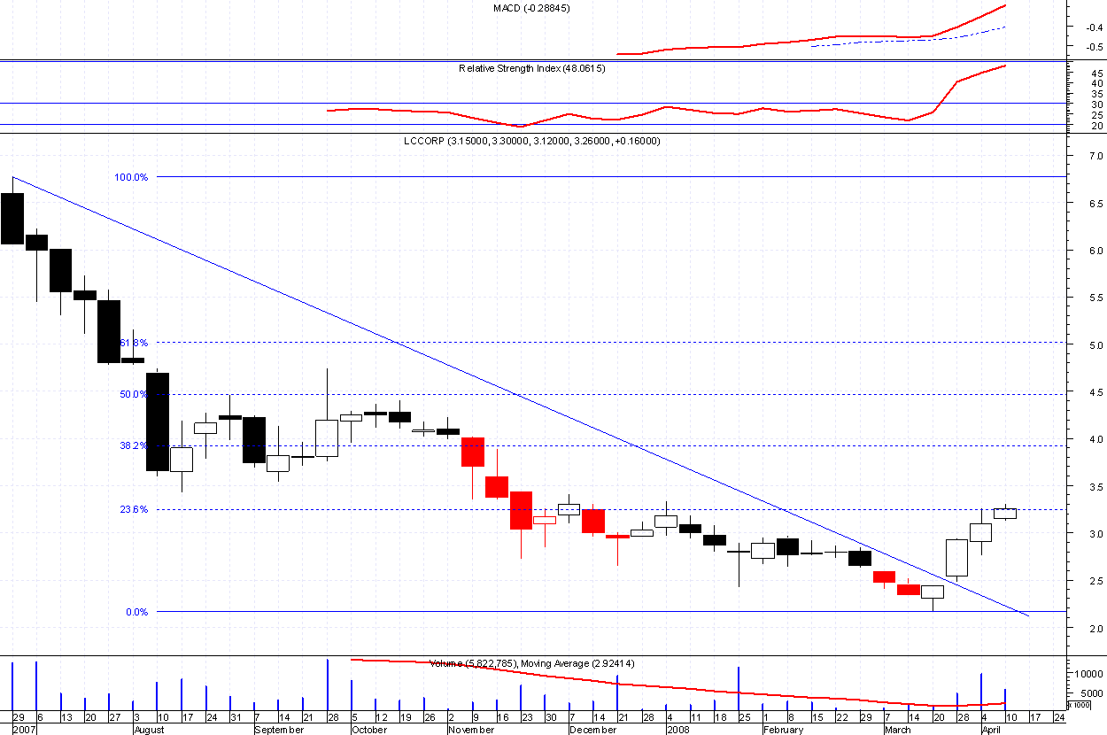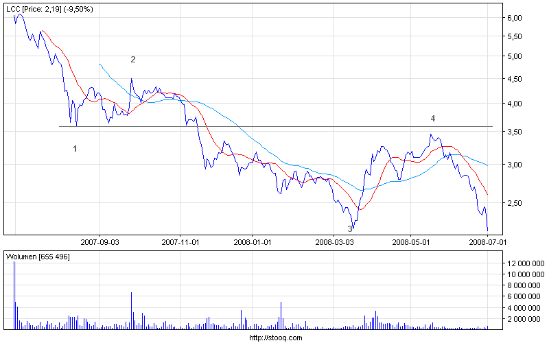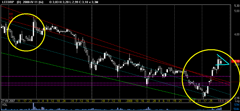 Na 60 min. lcc jest mocno wykupione, wisi korekta. Na day dalbym jej ruch do 2,6-2,7 zl. Fundamentalnie to ona lezy, zysk operacyjny -7,x mln za 2007.