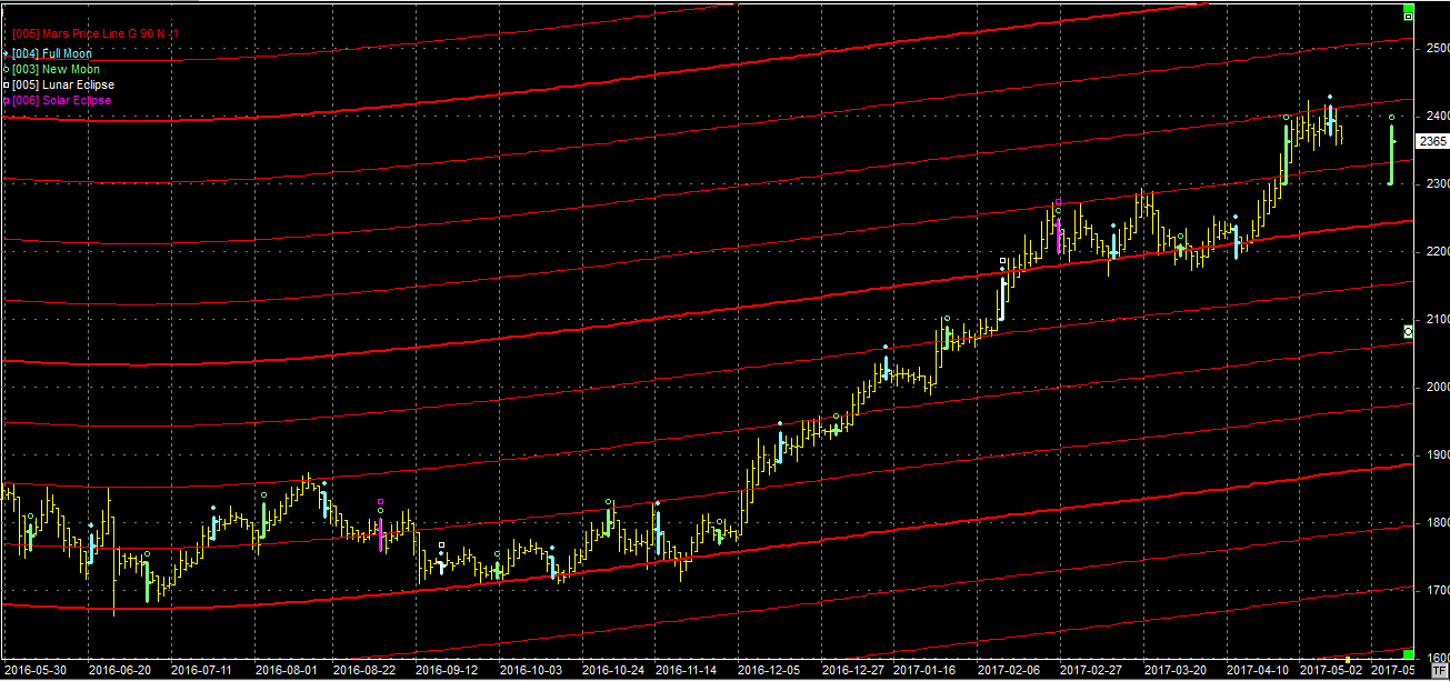 Na wykresie z liniami Marsa nadal jesteśmy na oporze na poziomie ok 2400 pkt. Środowa pełnia mogła wyznaczyć szczyt, choć na razie odejście od oporu jest kosmetyczne. Nadchodzący tydzień będzie decydujący. Jeśli bykom uda się pokonać opór to następny jest dopiero 100 pkt. wyżej. Jeśli nie to czeka nas zejście przynajmniej o dwa piętra, do linii położonej obecnie w okolicach 2250 pkt.