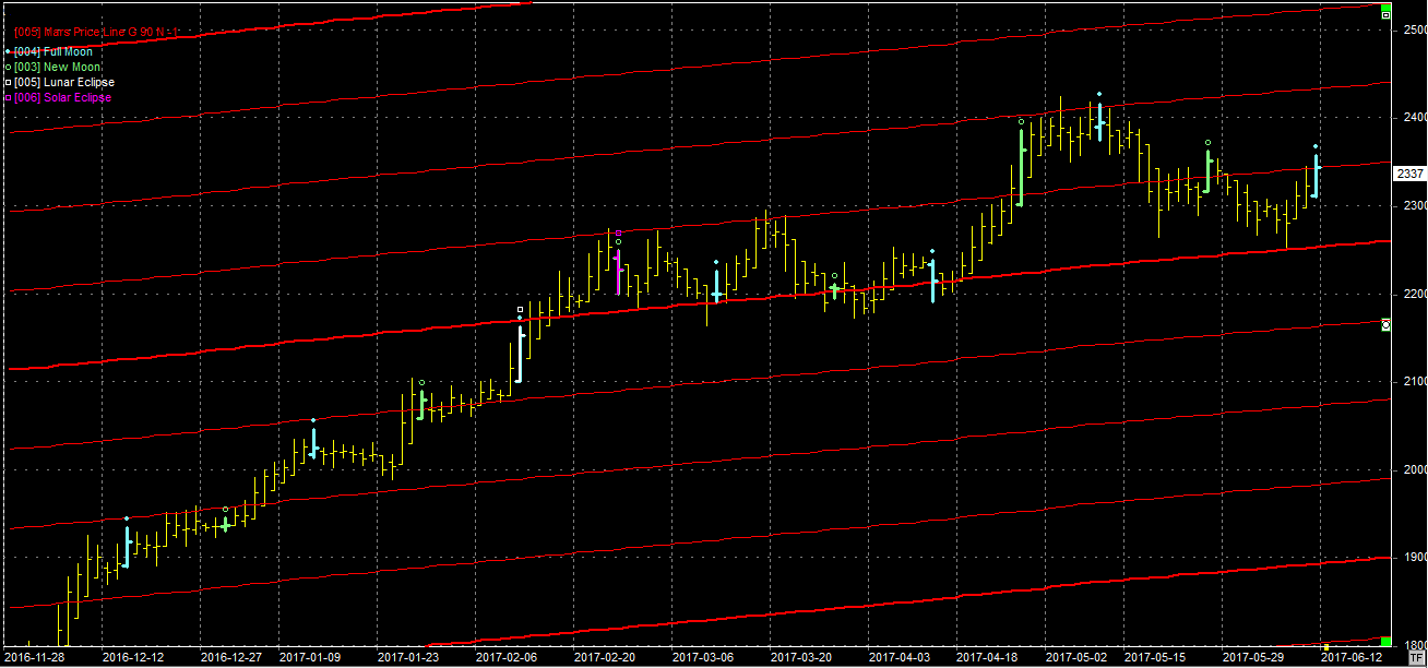Na wykresie z liniami Marsa pisałem w zeszłym tygodniu o kolejnej fali spadkowej. Fala ta materializuje się i może się już kończyć. Wtedy byłaby szansa na podwójne dno, choć lepiej byłoby przetestować wsparcie na linii Marsa położonej w okolicach 2250 pkt. i dopiero po tym teście rozpocząć ruch wzrostowy. Może pełnia 9.06 będzie tego ruchu zaczynem? Zobaczymy.