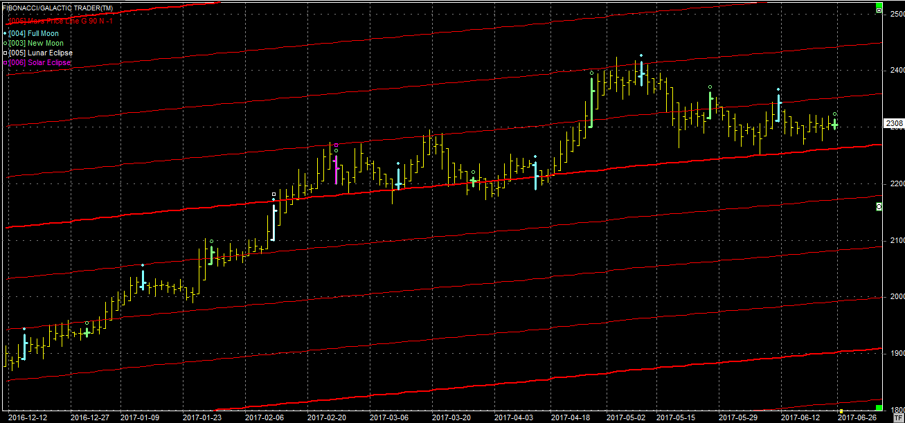 Na wykresie z liniami Marsa byki bronią wsparcia położonego na linii w okolicach 2280 pkt. Od tego czy uda się ta obrona zależeć będą dalsze ruchy. Jeśli sie uda to można oczekiwać kolejnych maksimów obecnej hossy. Jeśli nie to czeka rynek głębszy spadek, przynajmniej w okolice 2190 pkt.