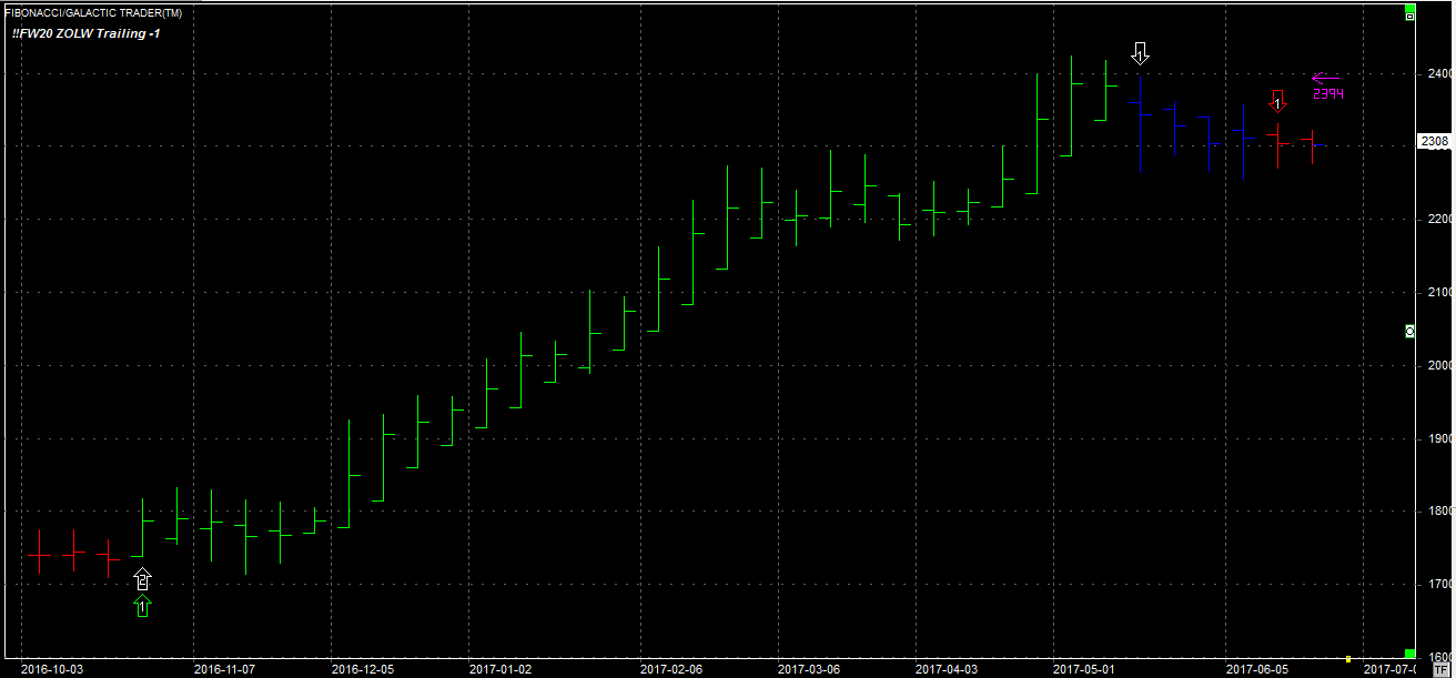 Tydzień zamknął się na poziomie 2308 pkt., 20 pkt. wyżej niż tydzień temu. System w na koniec zeszłego tygodnia zajął pozycję krótką. Jest to sztuczny sygnał związany ze zmianą serii kontraktów na wykresie. Stara seria zakończyła się na poziomie 2311 pkt. i na niej sygnału nie było. Można brać krótką na obecnych poziomach gdyż otwarcie wrześniowej serii było na poziomie 2304 pkt., a więc na obecnych poziomach. Stop dla pozycji 2394 pkt. Pozycja jest grana przeciw trendowi - 1 szt.