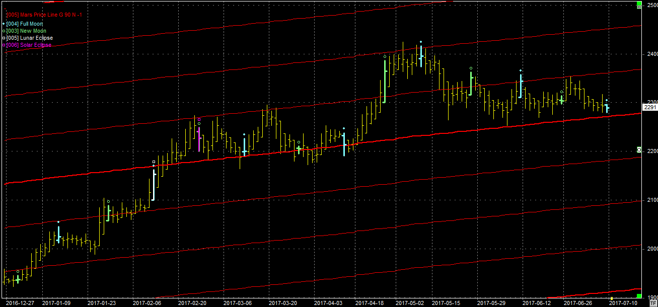 Na wykresie z liniami Marsa rysuje się szansa zakończenia korekty spadkowej. Bykom udało się obronić poziom 2280 pkt. a do tego dziś (09.07) mamy pełnię, która może odwrócić trend. Gdyby tak się nie stało to poprzedni wpis pozostaje w mocy.
