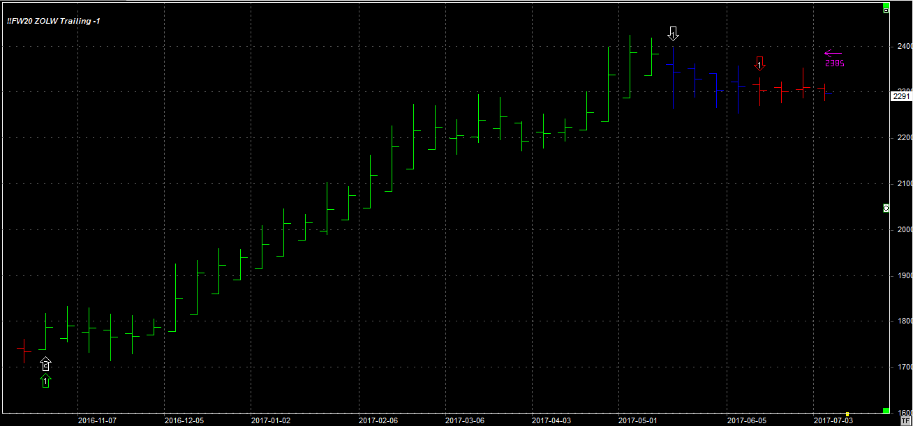 Tydzień zamknął się na poziomie 2291 pkt., 4 pkt. wyżej niż tydzień temu. System utrzymuje pozycję krótką po 2304 pkt. Stop dla pozycji 2385 pkt. Pozycja jest grana przeciw trendowi - 1 szt.