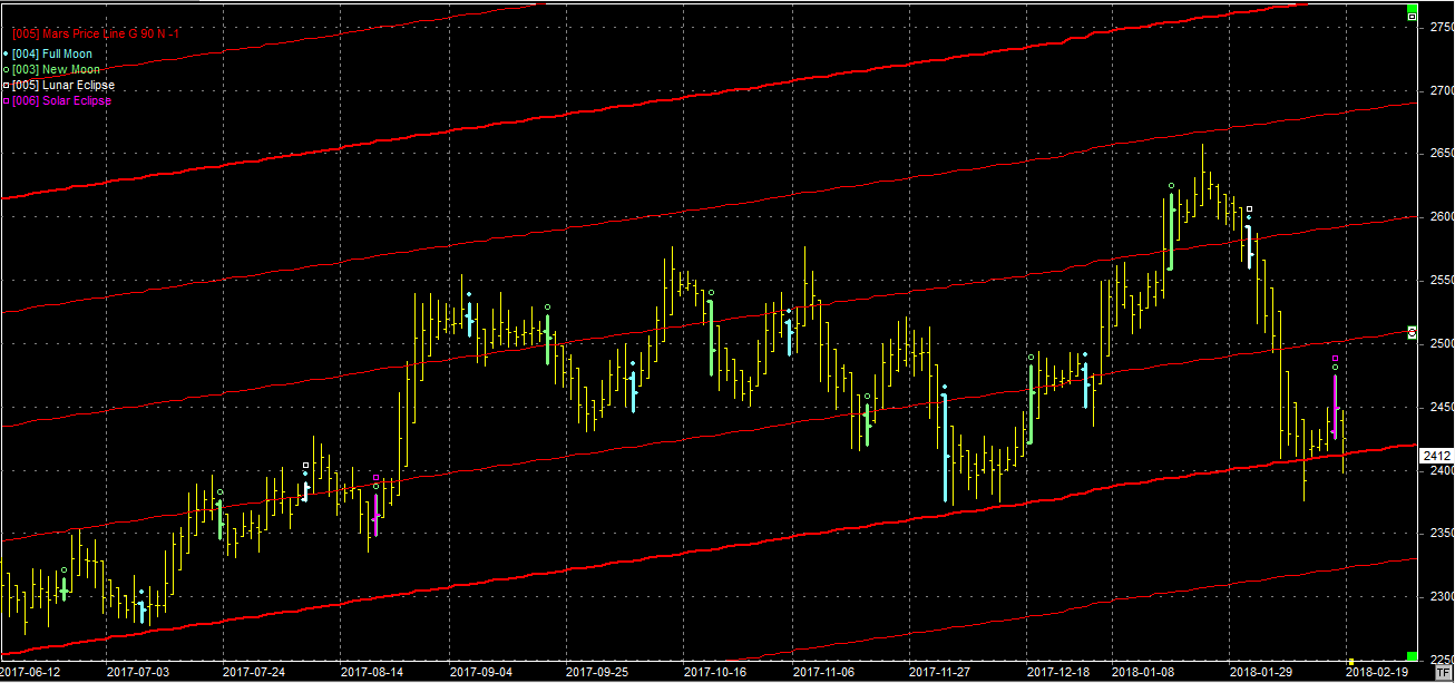 Na wykresie z liniami Marsa widać konsekwencje nieudanego ataku na opór na poziomie 2680 pkt. Rynek spadł jak cegła o trzy piętra, naruszając nawet wsparcie na poziomie 2410 pkt. Jest to bardzo ważna linia, więc prognozuję walkę o nią, zwłaszcza że rynek jest krótkoterminowo bardzo wyprzedany. Rynek powinien odbić przynajmniej w okolice 2500 pkt. Nów dopiero w przyszłym tygodniu, ale będzie on wzmocniony zaćmieniem Słońca.