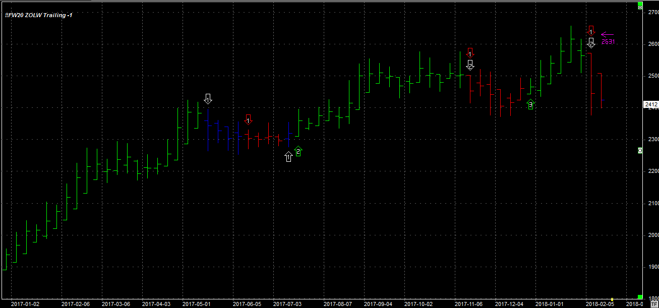 Tydzień zamknął się na poziomie 2412 pkt., 21 pkt. wyżej niż tydzień temu. System utrzymuje pozycję krótką - 1 szt. po 2391 pkt. Stop 2631 pkt.