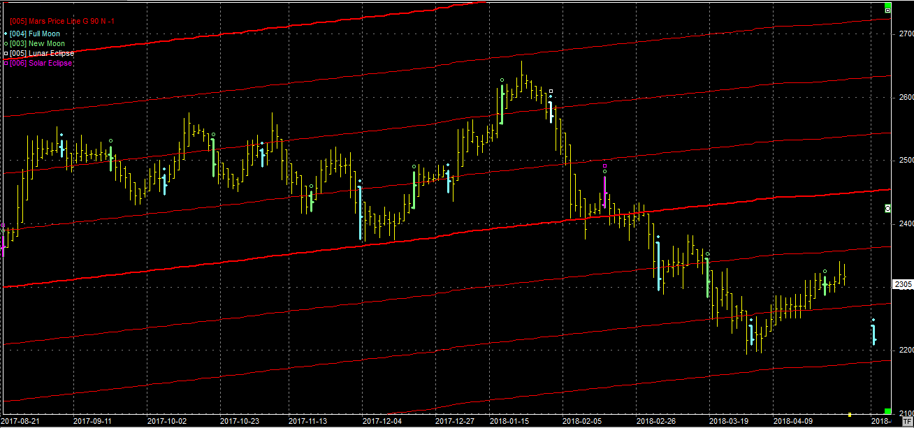 Na wykresie z liniami Marsa widzimy podejście do pierwszego oporu, po udanej obronie wsparcia na poziomie 2260 pkt. Opór jest 100 pkt. wyżej, więc do linii jeszcze trochę brakuje. Problemem może być poniedziałkowy nów, który może zmienić kierunek ruchu. Jeśli okaże się tylko korektą, to atak na opor powinien nastąpić jeszcze w tym tygodniu. Korekta może przetestować ponownie linię wsparcia, która podnosi sie i znajduje się obecnie na poziomie 2270 pkt. Powtórna obrona tego wsparcia dałaby szansę na trwalszą poprawę koniunktury na W20.