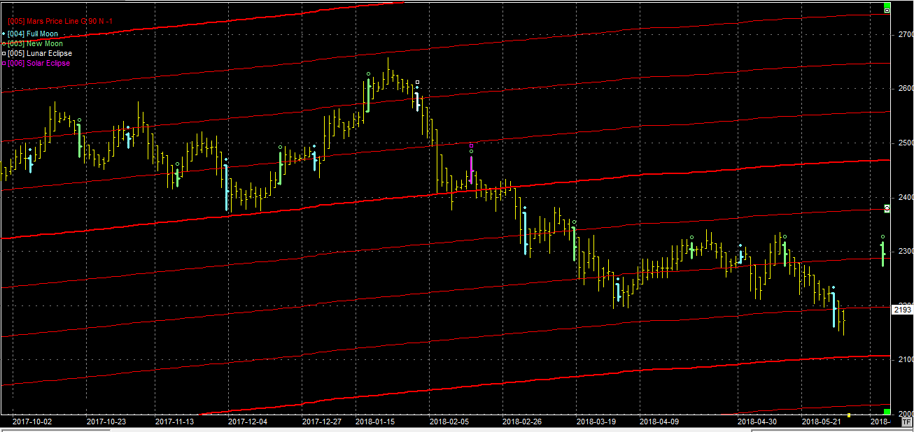 Na wykresie z liniami Marsa kurs dotarł do wsparcia na poziomie 2200 pkt. Zamknięcie wypadło nieco powyżej ale to na razie nie jest zdecydowana obrona. Ta powinna się jednak pojawić, zwłaszcza że 29.05 jest pełnia i ta, jako element zwrotny" powinna pomagać bykom.