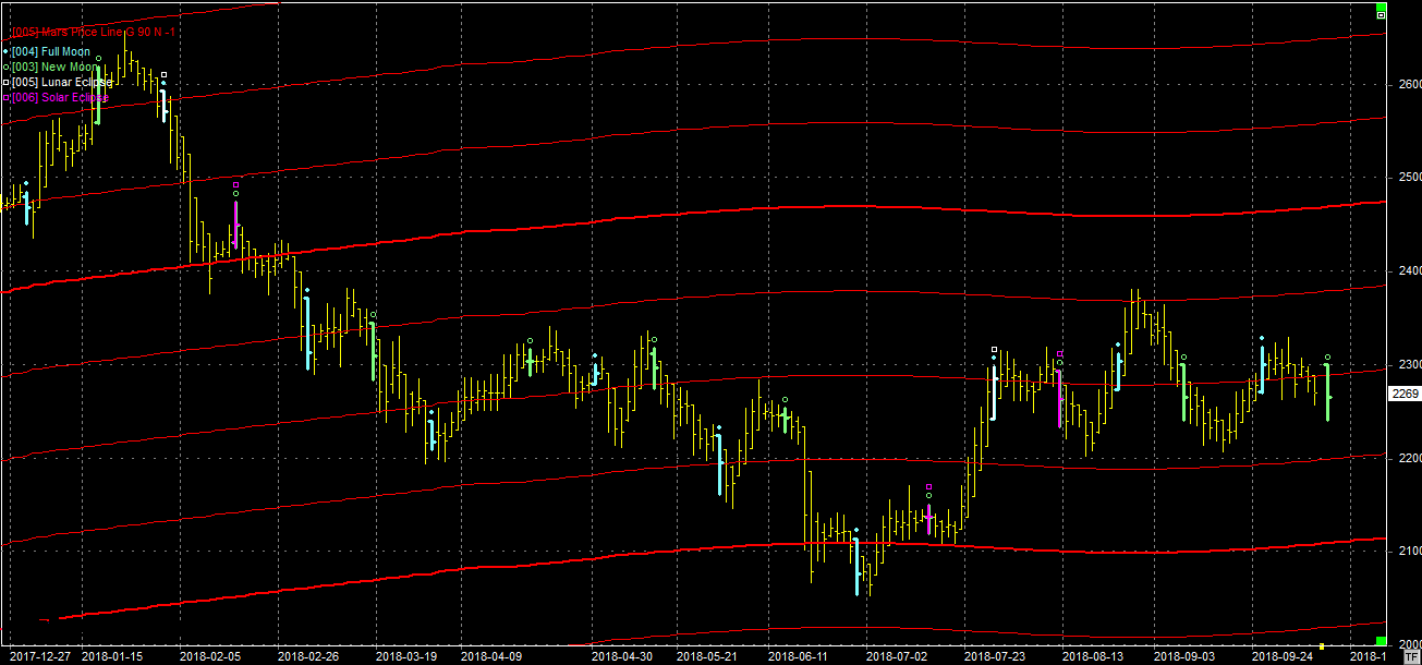 Na wykresie z liniami Marsa można przyjąć, że ostatnia pełnia (+/-2 dni) zawróciła rynek. Tworzy sie wiec prawe ramię formacji RGR, która nie zwiastuje nic dobrego dla byków. Linia szyi przebiega w okolicach 2200 pkt. Jest to również wsparcie wynikające z przebiegającej linii Marsa. Jeśli ta bariera zostanie przebita, to formacja odwrócenia zostanie aktywowana. To oczywiście niedźwiedzi scenariusz, który zostanie anulowany jeśli rynek przebije ostatnią górkę.