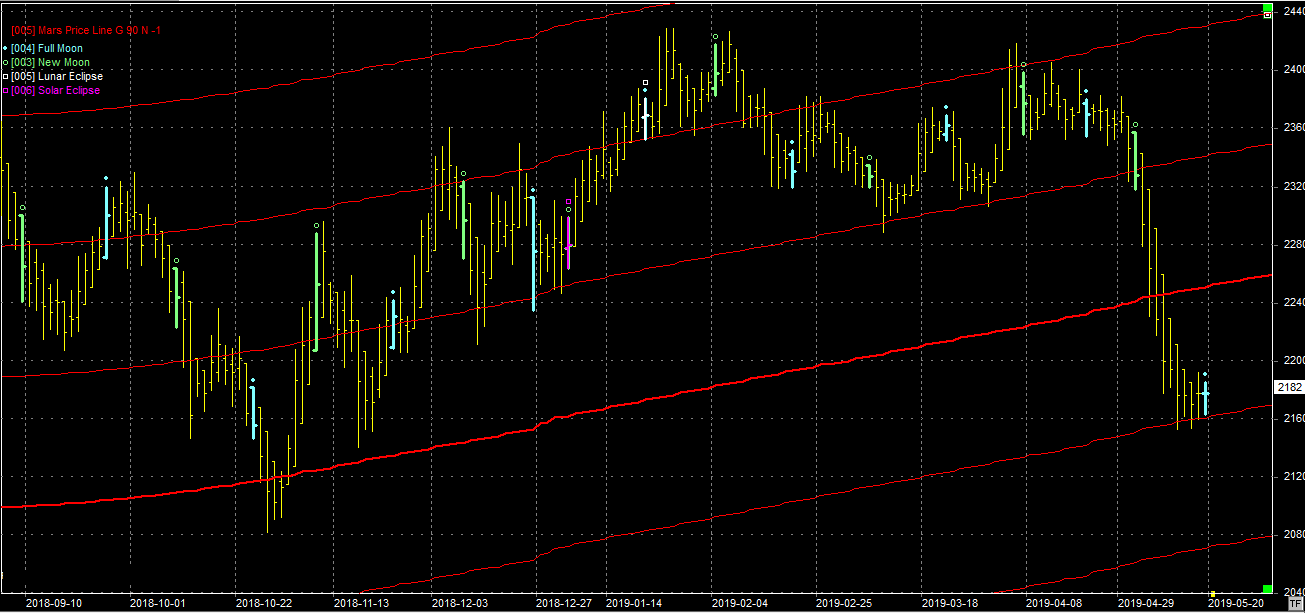 Na wykresie z liniami Marsa kurs konsoliduje się na wsparciu na poziomie 2180 pkt. Na razie nie ma ochoty odbić, mimo solidnych wzrostów od dołka na rynkach bazowych. Byli mogą jednak pokładać nadzieję w sobotniej pełni, która może odwrócić tendencję. Jeśli się uda, to pierwszy opór jest na poziomie 2260 pkt. Kolejne wsparcie, w przypadku przełamania obecnego, na 2080 pkt.