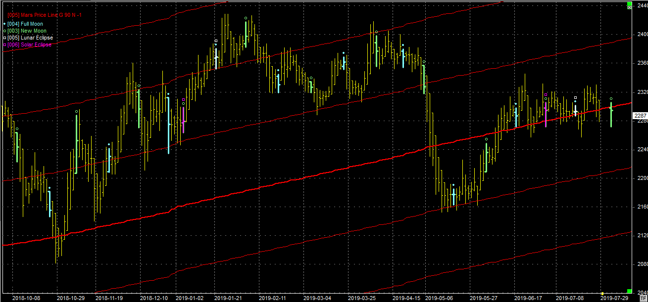 Na wykresie z liniami Marsa niestety byki nie utrzymały zdobyczy z poprzedniego tygodnia i ponownie jest testowane wsparcie na poziomie 2290 pkt. Niestety nie wygląda to dobrze i tym razem może się nie udać obronić tego wsparcia. Następne jest na poziomie 2220 pkt. Na niebie czeka nas nów, który uściśla sie 01.08.19 r.
