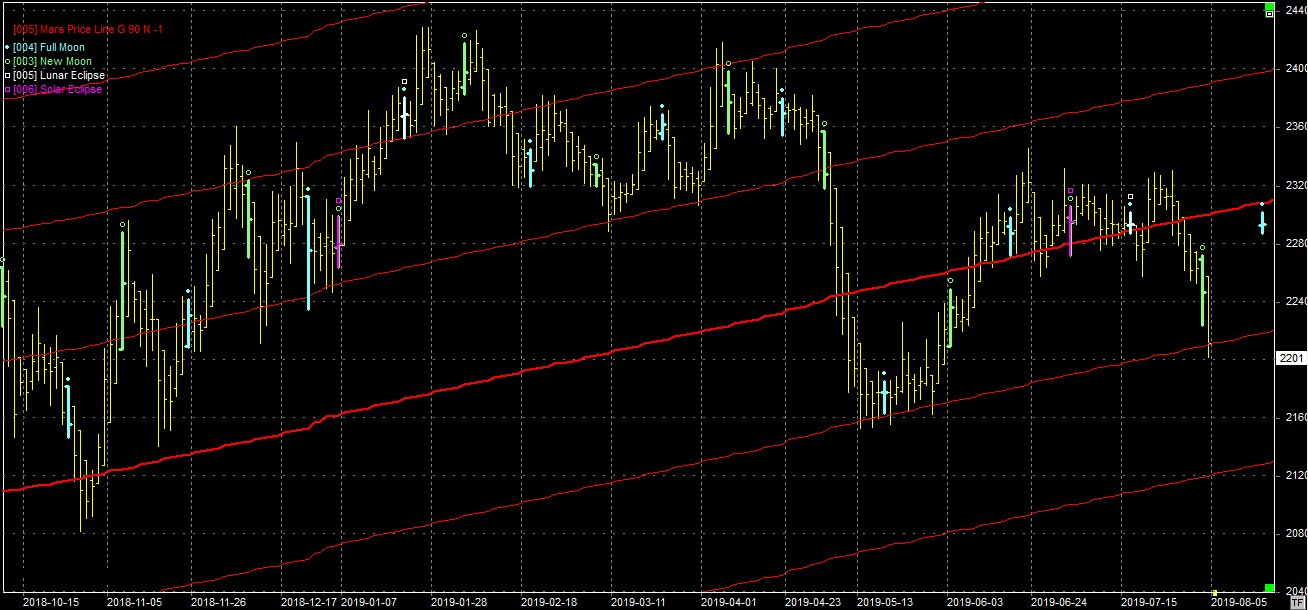 Na wykresie z liniami Marsa niestety byki nie utrzymały zdobyczy z poprzedniego tygodnia i ponownie jest testowane wsparcie na poziomie 2290 pkt. Niestety nie wygląda to dobrze i tym razem może się nie udać obronić tego wsparcia. Następne jest na poziomie 2220 pkt. Na niebie czeka nas nów, który uściśla się 01.08.19 r.
