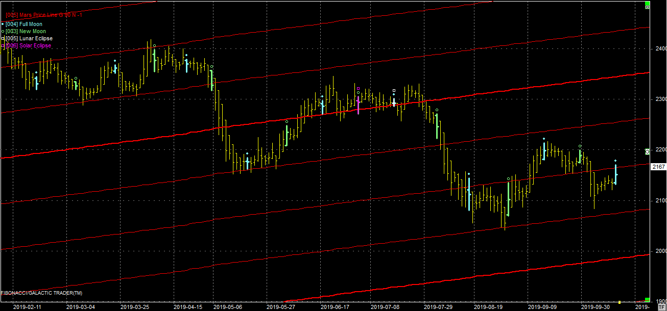Na wykresie z liniami Marsa bykom nie udało się utrzymać wsparcia na linii w okolicach 2160 pkt. Ostatni nów zakończył bowiem odbicie wzrostowe. Obecnie wsparciem jest linia na poziomie 2150 pkt. , do której jeszcze trochę brakuje. Z czasem rynek powinien tam dotrzeć., podobnie jak było to w sierpniu b.r.