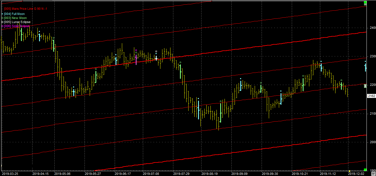 Na wykresie z liniami Marsa widzimy, że byki nie utrzymały wsparcia położonego na linii w okolicach 2200 pkt. Nów nie pomógł w odwróceniu tendencji, a to źle wróży na końcówkę roku. Wygląda na to, że 2020 rok będziemy zaczynali z niskiej bazy. Najbliższe wsparcie znajduje się bowiem dopiero na poziomie 2110 pkt. Ta linia jest bardzo ważna w kontekście dalszego zachowania się kursu, bowiem już dwukrotnie w tym roku broniła rynek przed głębszym spadkiem.  Zwykle po trzech atakach taka linia pada. Zobaczymy jak będzie tym razem, jeśli tam dotrzemy. Za bykami stoi obecnie jedynie końcówka roku, która bywa tradycyjnie bycza, ale przy spadkowym całym roku nie jestem przekonany, czy znajdą się chętni na wyciąganie rynku za uszy…