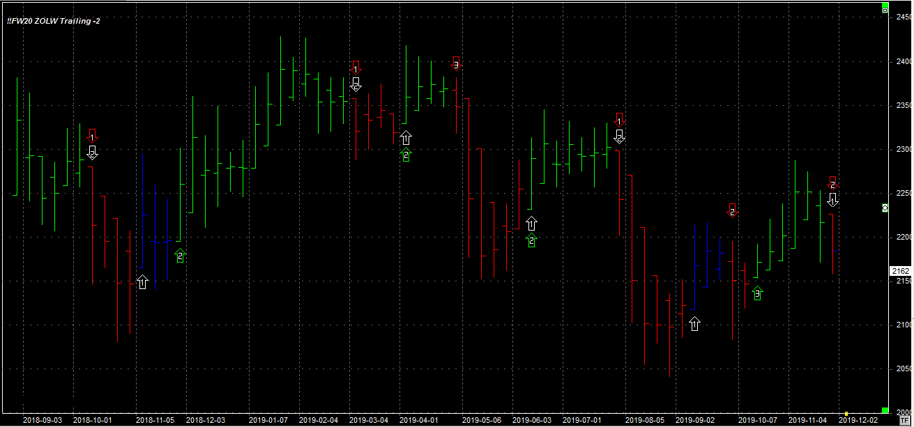 Tydzień zamknął się na poziomie  2162 pkt., 33 pkt. niżej niż tydzień temu. System zamknął pozycję długą na stopie po 2166 pkt. i odwrócił się na krótką - 2 szt. po 2162 pkt.
