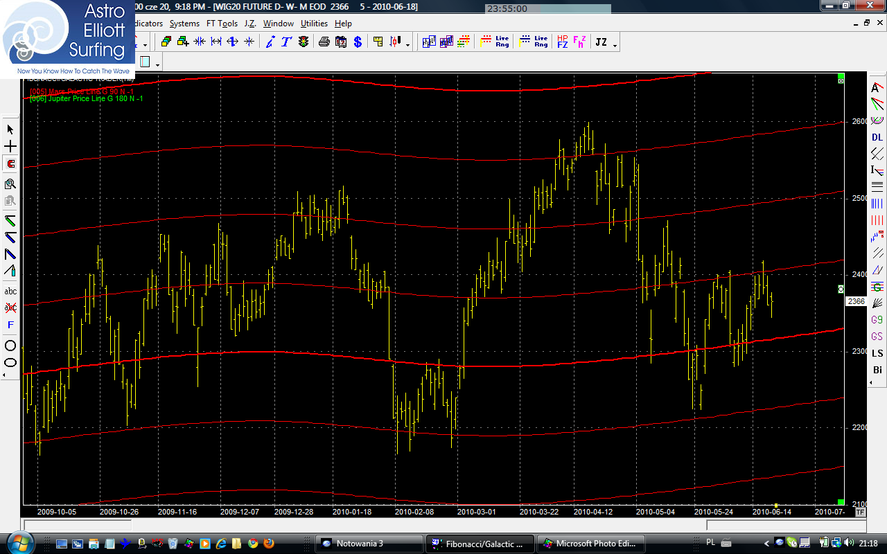 Na wykresie z liniami Marsa ponowny atak na linię przebiegającą w okolicach 2400 pkt znów zakończył się porażką byków. Zwykle takie sytuacje kończyły się większym odejściem. Tym razem jednak mieliśmy do czynienia z zamknięciem serii, która może w krótkim terminie nieco zaburzyć ten wzorzec. Czy tak się stanie nie jestem w stanie orzec w obecnej chwili. Najrozsądniejsze wydaje się obecnie odejście do linii wsparcia przebiegającej na poziomie ok 2320 pkt i tam podjęcie decyzji co do dalszych ruchów. W przypadku przebicia twego wsparcia następne znajduje się dopiero w okolicach 2230 pkt.