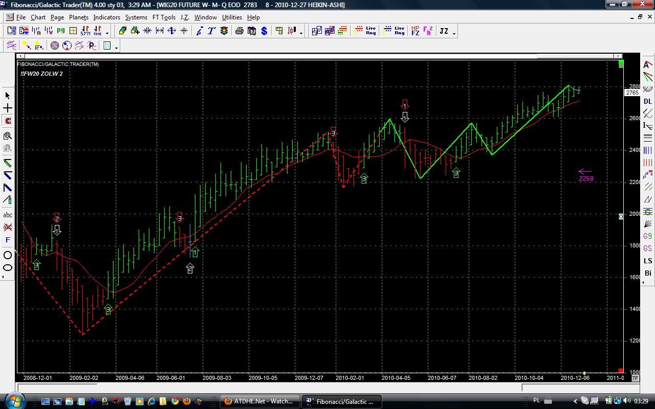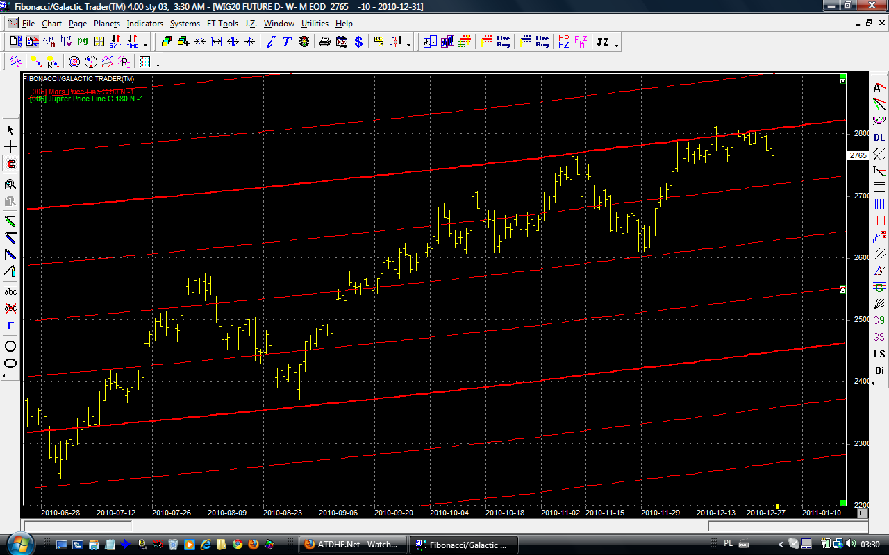Na wykresie z liniami Marsa mamy odejście od linii oporu. Jeżeli nie zostanie ona sforsowana na początku tygodnia to czeka nas wg mnie odejście co najmniej do linii najbliższego wsparcia. Piszę minimum gdyż rynek męczył się strasznie przy oporze i nie mógł go pokonać. To może powodować wzrost liczby zawiedzionych byków.