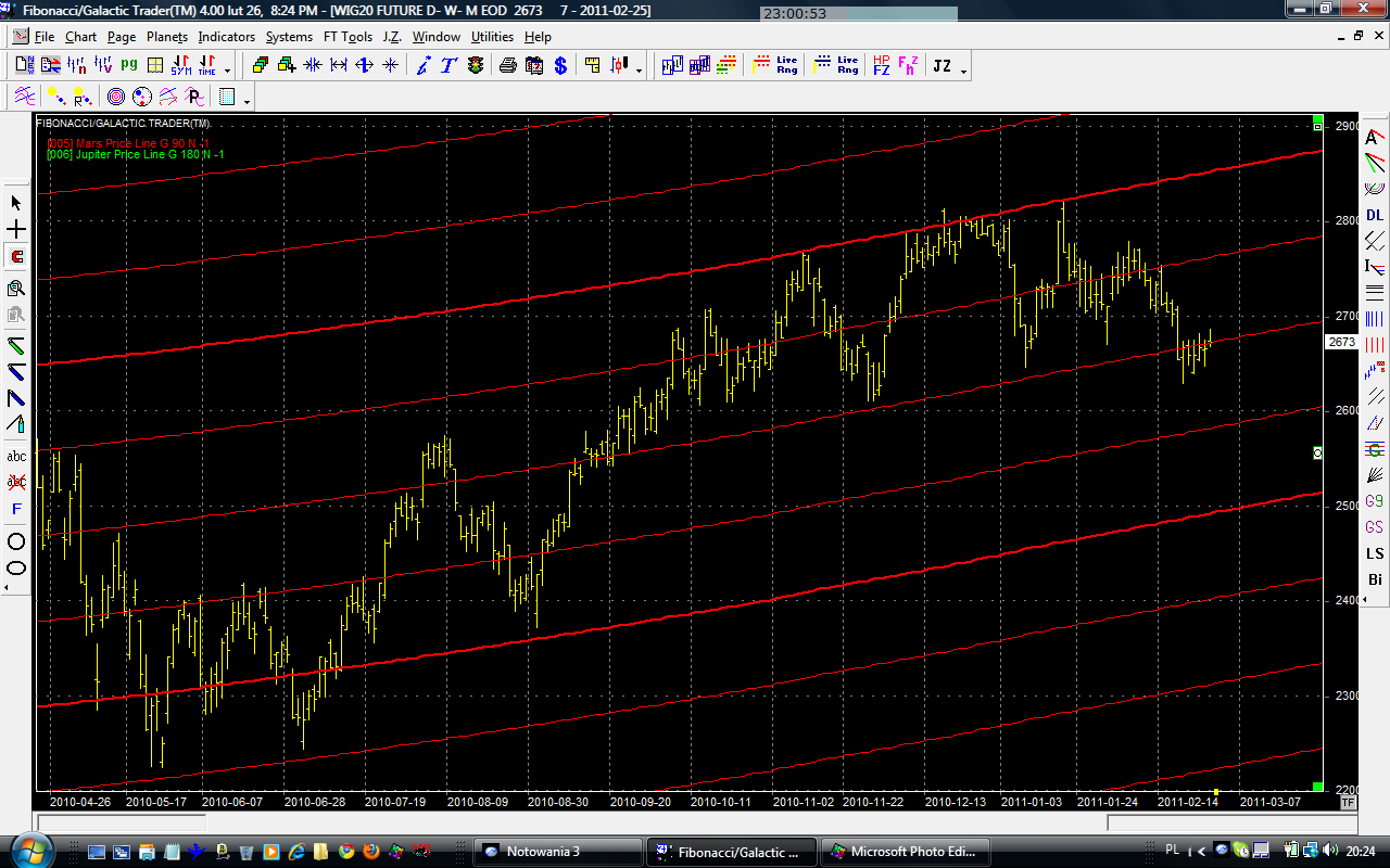 Na wykresie z liniami Marsa linia wsparcia nadal się trzyma. Od wyników walki na niej będzie zależeć dalszy los kontraktów. Na razie sprawa jest otwarta co do kierunków.