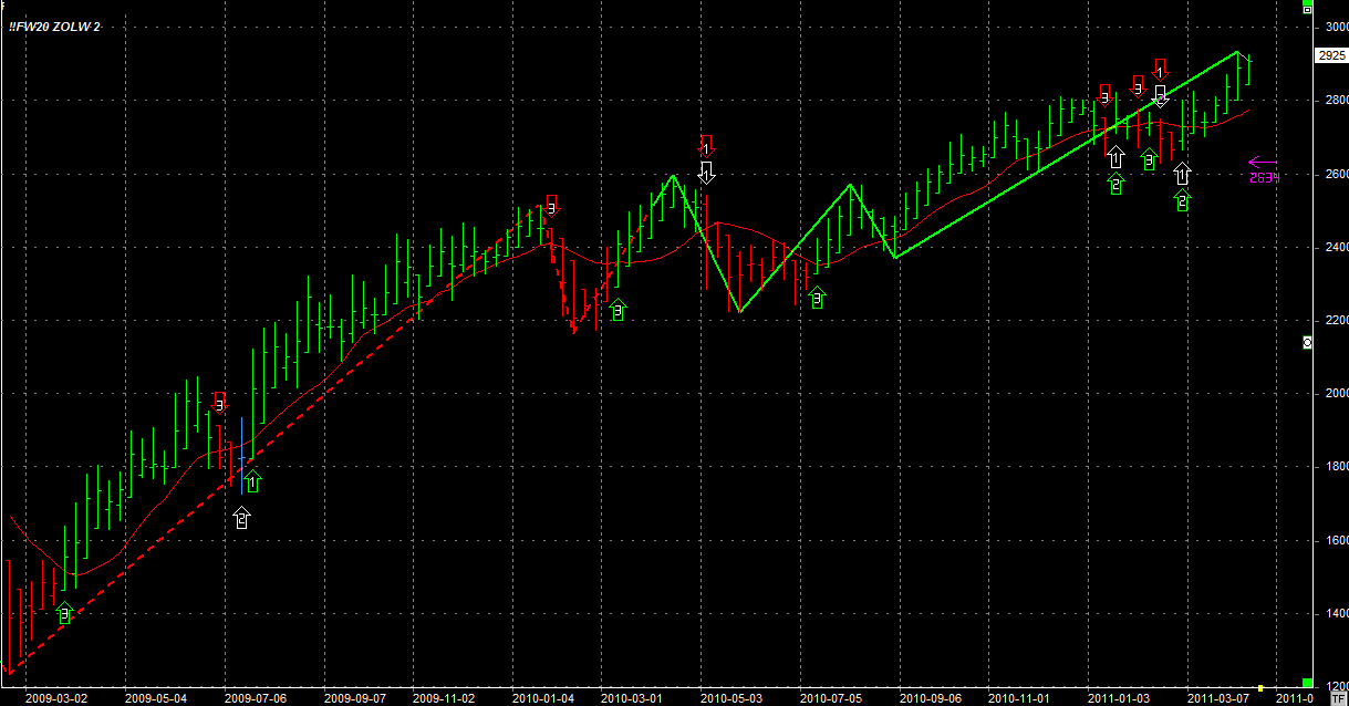 Na Żółwiu jedyna zmiana to zmiana tickera pokazująca zamknięcie tygodnia. Poza tym nic nowego. System nadal utrzymuje 2 długie kupione po 2789 pkt.