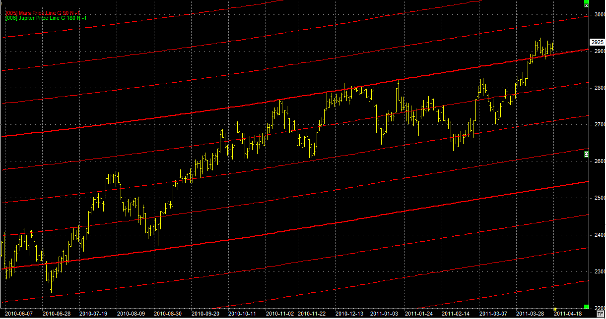 Na wykresie z liniami Marsa testowano w tym tygodniu przebitą bardzo ważną linię oporu. Test, jak dotąd, wypada pomyślnie, i choć w przyszłym tygodniu możemy powrócić do testowania, to odejście z końca tygodnia daje nadzieje na ruch wyżej. Jeżeli tak się stanie to następna linia oporu znajduje się w okolicach 2970 pkt. Linia ta unosi się ku górze więc sama wartość zależy od czasu dotarcia do niej.