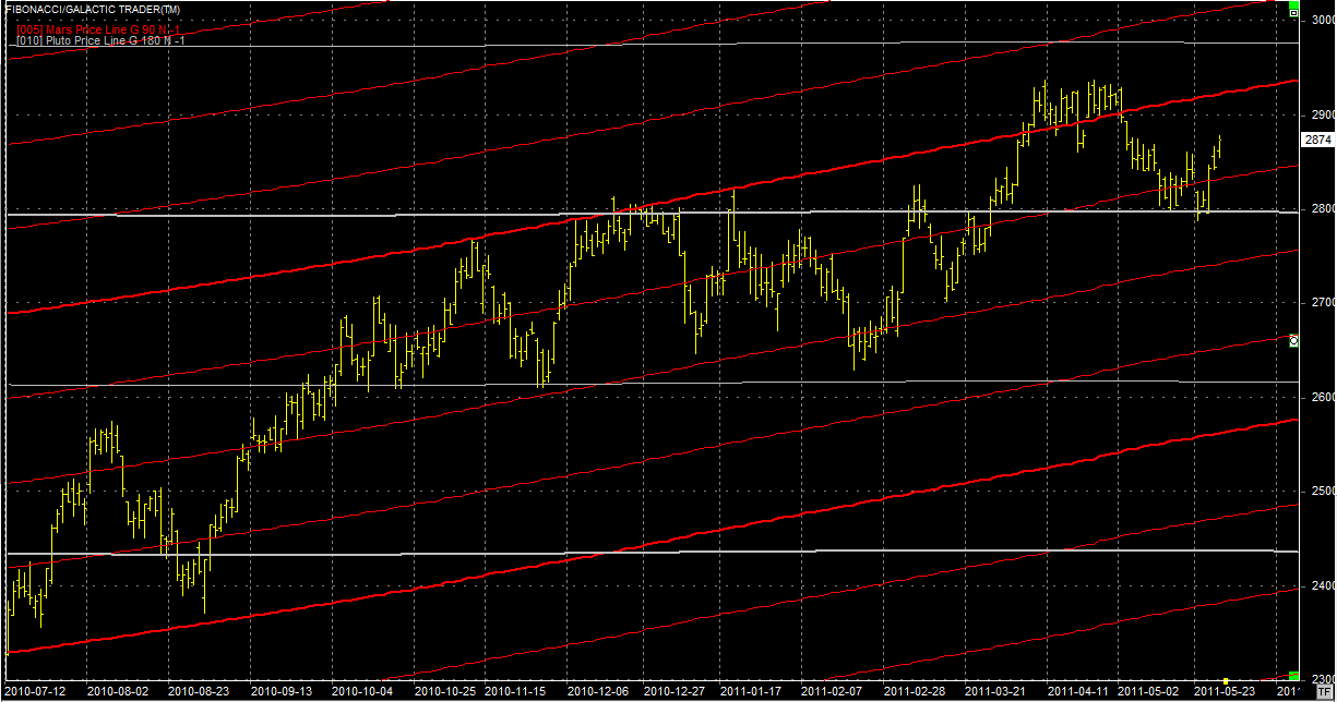 Na wykresie z liniami Marsa w ostatnim tygodniu została przełamana linia wsparcia ale rynek powrócił nad nią w niezłym stylu. Oznacza to możliwość ruchu ku oporowi w okolicach 2930-40 pkt. Zastanawiałem się dlaczego rynek po przełamaniu wsparcia nie ruszył na południe ku linii z okolic 2750 pkt. Odpowiedzią może być linia Plutona, która na przestrzeni od grudnia 2010 do marca 2011 była silnym oporem, a po przełamaniu stała się silnym wsparciem. Właśnie od tej linii rynek silnie się odbił. Linie Plutona przebiegają horyzontalnie wiec mogą mieć znaczenie w zasadzie tylko przy większych konsolidacjach i wybiciach z nich, wyznaczając linie oporu o wsparcia. Tak było i tym razem gdyż rynek dotarł do poprzedniego górnego ograniczenia zakresu wahań. Popatrzymy na tę linię przez czas jakiś