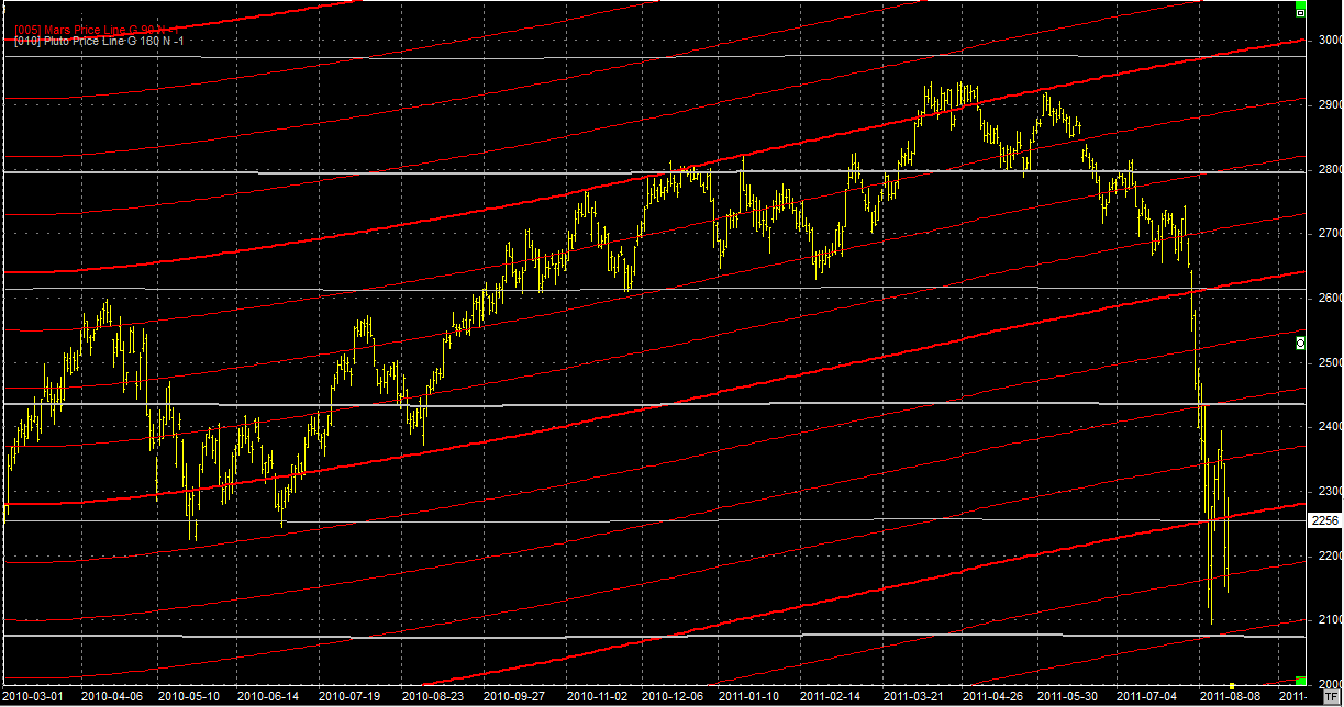 Na wykresie z liniami Marsa mamy zapowiadany retest wsparcia z okolic 2200 pkt. Sądzę, że zobaczymy kolejną próbę podniesienia rynku. Może nawet w okolice 2450 pkt gdzie sąsiadują ze sobą linia Marsa i Plutona. Zmienność jest nadal duża wiec ruchy dzienne po kilkadziesiąt punktów powinny się nadal utrzymywać. Raj dla daytraderów. Pozycyjni gracze na razie nie mają czego szukać na rynku.