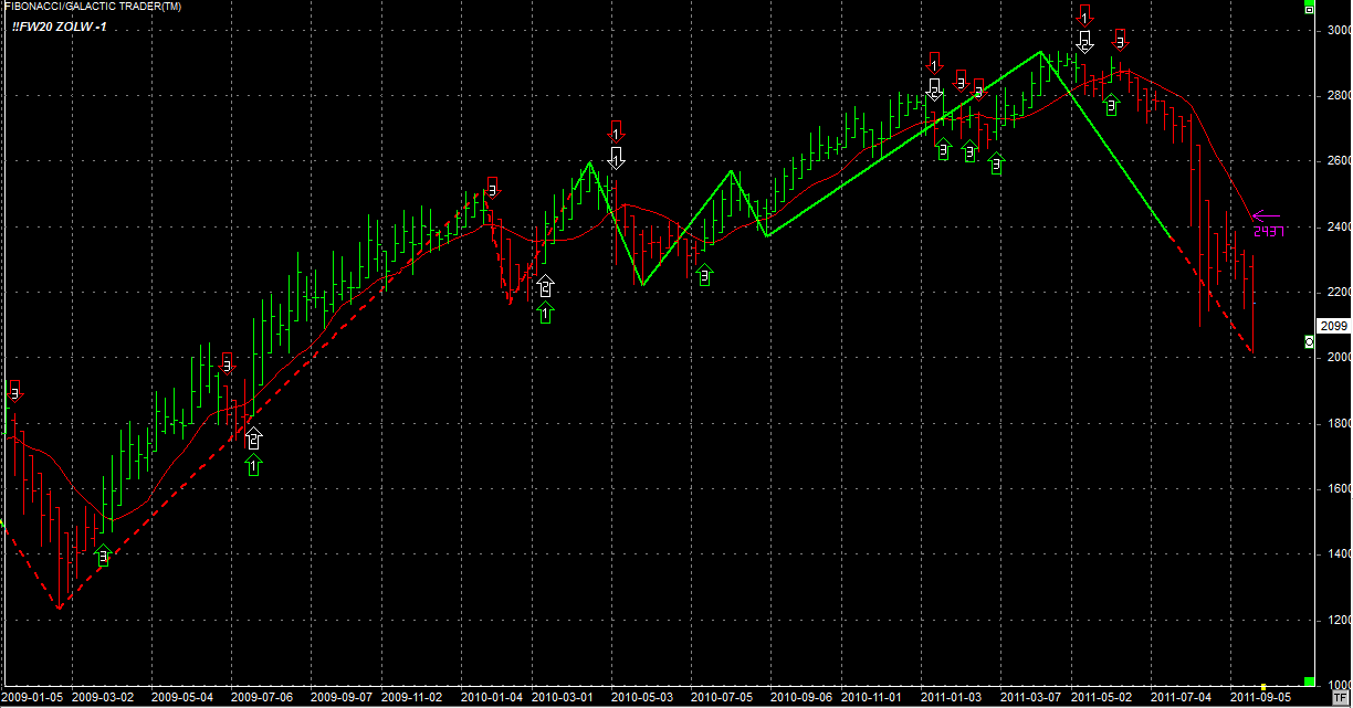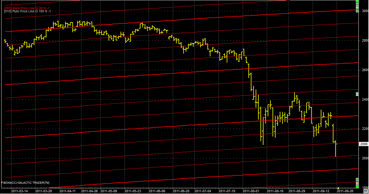 Na wykresie z liniami Marsa po korekcyjnych podrygach, zatrzymanych dość precyzyjnie na oporach, przyszedł czas na test kolejnego wsparcia znajdującego się nieco powyżej 2000 pkt. Na razie test wypadł pozytywnie gdyż po dotknięciu linii Marsa znajdującej się na tym poziomie rynek odskoczył prawie 100 pkt wyżej. Obecnie znajduje się na oporze. Wydaje mi się, że to nie koniec odbicia. Od poziomu 2450 pkt spadliśmy wszak o 5 pięter. 2-3 z nich wypadałoby skorygować...