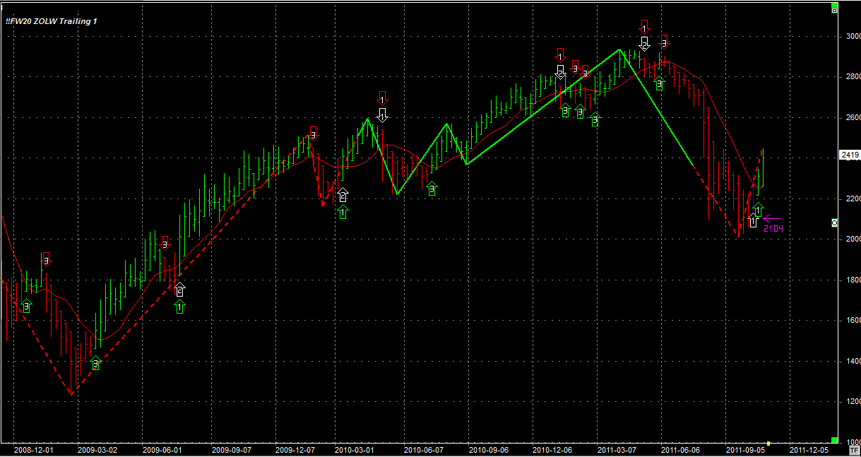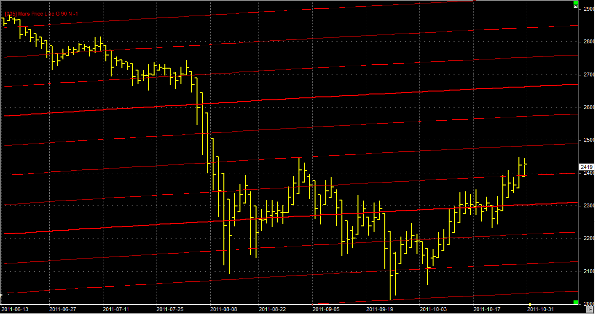 Na wykresie z liniami Marsa mamy wybicie ponad pierwszy opór ale z dojściem do następnego są na razie poważne trudności. Nie wiem czy doczłapiemy się w okolice 2500 za jednym zamachem, czy może konieczne będzie cofnięcie i "udeptanie" wsparcia na poziomie 2400. Zobaczymy. Szczerze mówiąc to jestem zawiedziony postawą byków bo my znieśliśmy niecałe 50% ostatnich spadków, podczas gdy rynku za oceanem prawie 75%. Tyczy się to z resztą również pozostałych europejskich parkietów. Jednym słowem coś śmierdzi nadal...