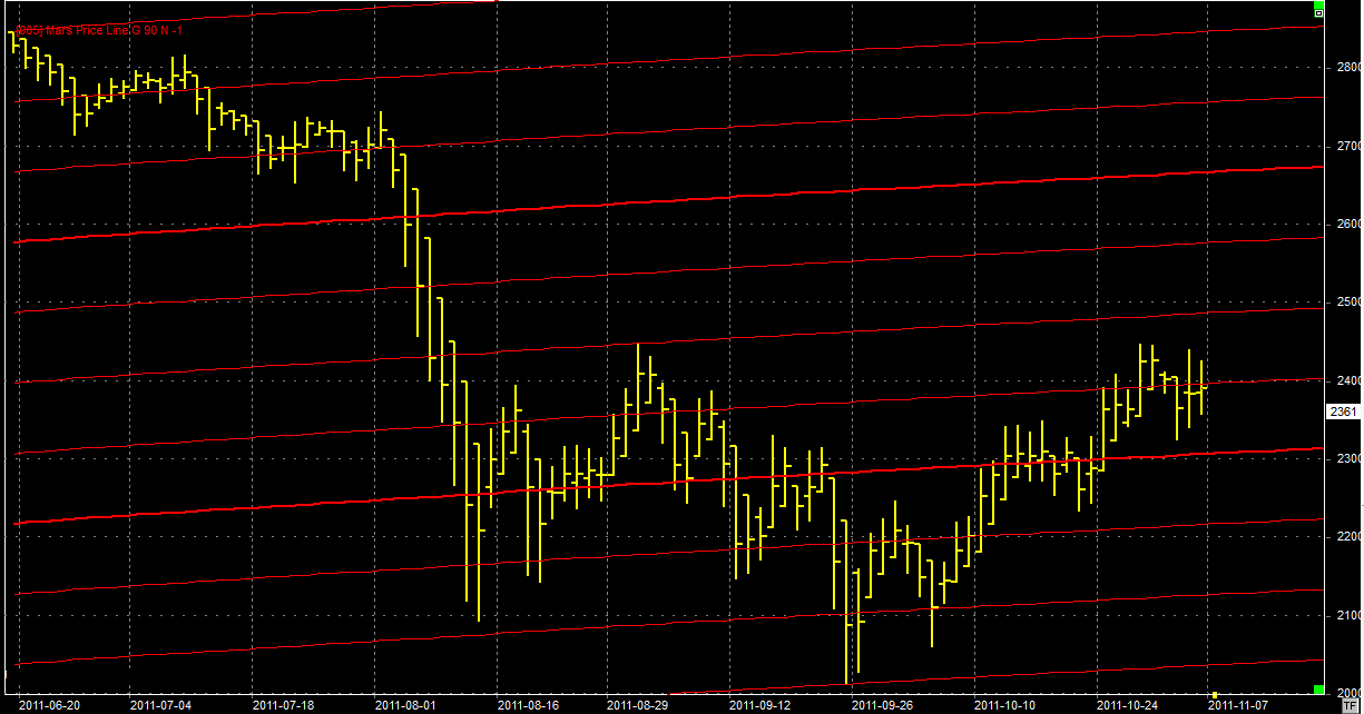 Na wykresie z liniami Marsa jesteśmy przyklejeni do jednej z nich. Na prawdę dawno czegoś takiego nie widziałem ale wg mnie znamionuje to przygotowanie do większego ruchu. Kierunek pozostaje niestety niewiadomą i trzeba będzie tak jak dotychczas reagować na sygnały intraday. Pozycyjna gra od kilku tygodni nie ma najmniejszego sensu ale powinno to się zmienić. Na niebie nie widziałem jakiś ciężkich aspektów ale tu niech się wypowiedzą specjaliści. Na sobotę newsy z Grecji są umiarkowanie pozytywne więc o ile się nic nie zmieni powinniśmy zacząć tydzień od wzrostów.