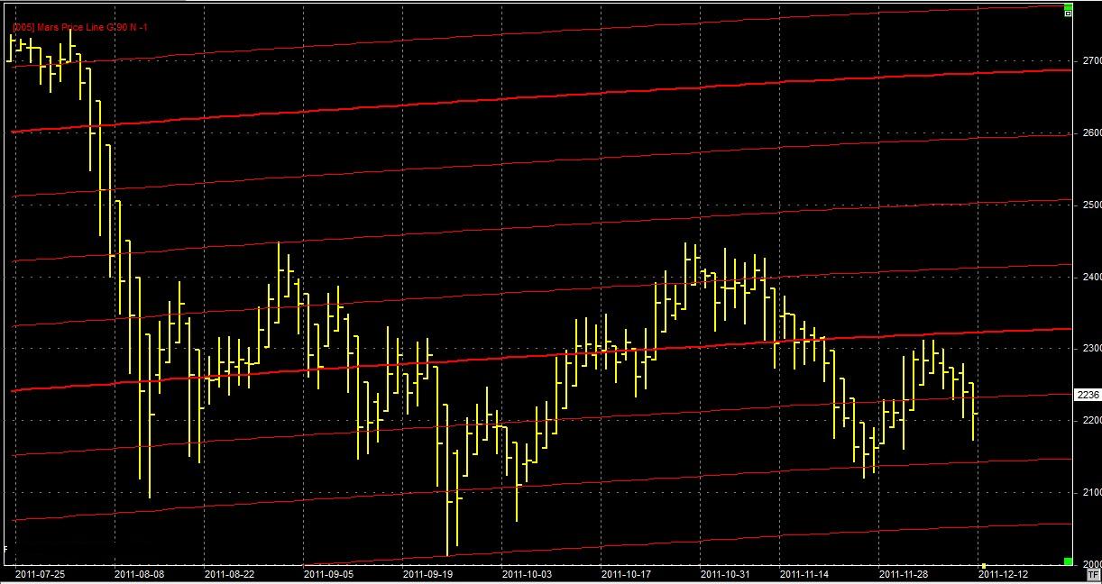 Na wykresie z liniami Marsa sytuacja nie jest jasna. Rynek wyłamał się, przebijając wsparcie z okolic 2240 pkt ale, nie docierając do kolejnego, próbuje nad nie powrócić. Od wyników tej próby zależy dalszy układ w krótkim terminie. Jeżeli będzie to tylko retest od dołu to najpewniej czeka nas zejście w okolice 2150 pkt. Udany powrót to szansa na ruch ponownie w okolice 2320 pkt.