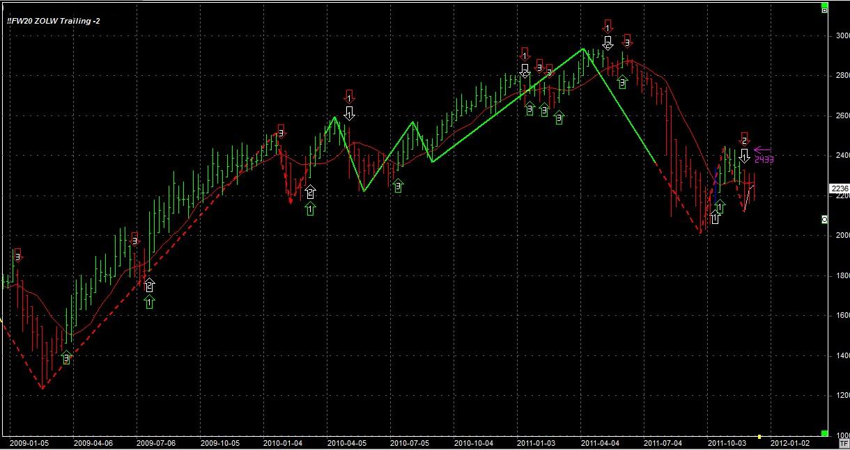 Tydzień zamknął się na poziomie 2236 pkt, 39 pkt niżej niż tydzień temu. System utrzymuje nadal dwie krótkie pozycje po 2176 pkt. Stop na 2433 pkt.