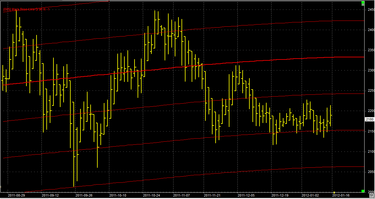 Na wykresie z liniami Marsa bronimy wsparcia w okolicach linii Marsa na 2150 pkt. Na razie bykom się to udaje. Jest to wg mnie kluczowa linia, gdyż w okresie prezentowanym na wykresie ta linia była broniona ponad 8 razy. Jeżeli uda się to ponownie to sądzę że zawiedzione niedźwiedzie i rozjuszone byki wyprowadzą indeks co najmniej w okolice oporu na 2350 pkt. Jeżeli nie to czeka nas ruch w dół o podobnej dynamice do tego listopada ubiegłego roku - winda w dół o co najmniej dwa piętra.