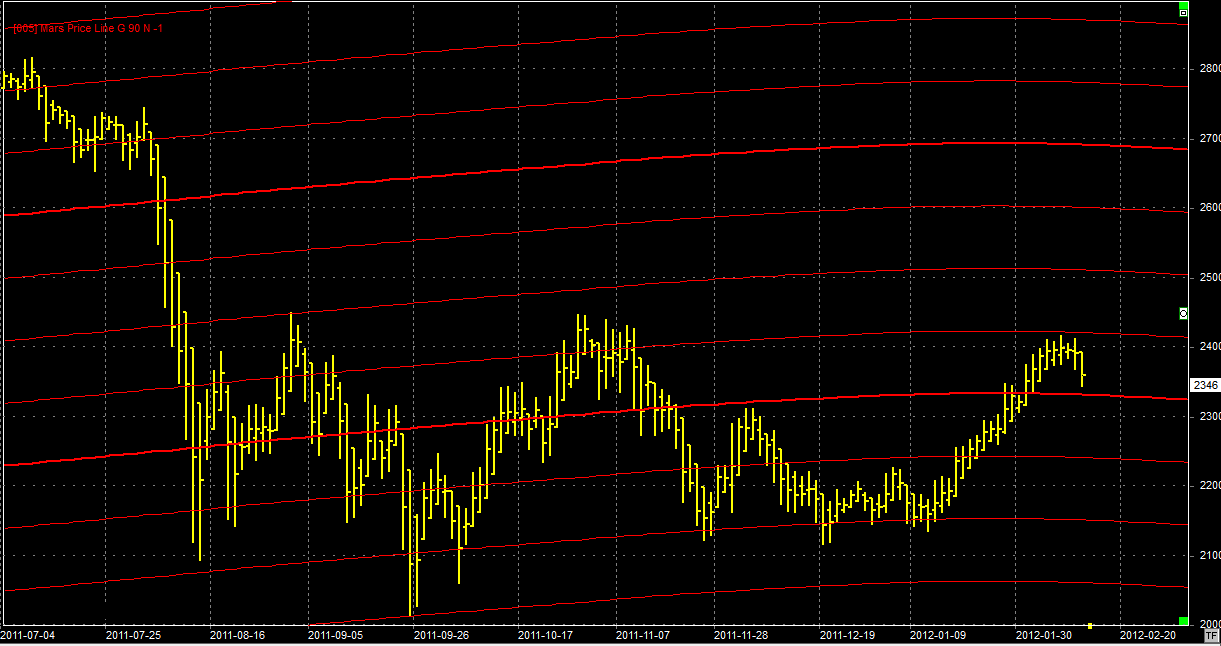 Na wykresie z liniami Marsa wykres kontraktów dotarł do linii oporu w okolicach 2420 pkt i zwrócił. Wspominałem w poprzednim tygodniu, że to dość silny opór. Obecnie jesteśmy na wsparciu. Póki co jest to naturalny ruch i nie wydaje się groźny ale jeżeli ruch wzrostowy ma być kontynuowany to wsparcie na tej linii musi wytrzymać. Niższe zejście moim zdaniem wyzwoli dodatkową podaż zawiedzionych byków, którzy kupowali na "dołku". Nadchodzący tydzień jawi się więc dość ciekawie z punktu widzenia istotności zmian.