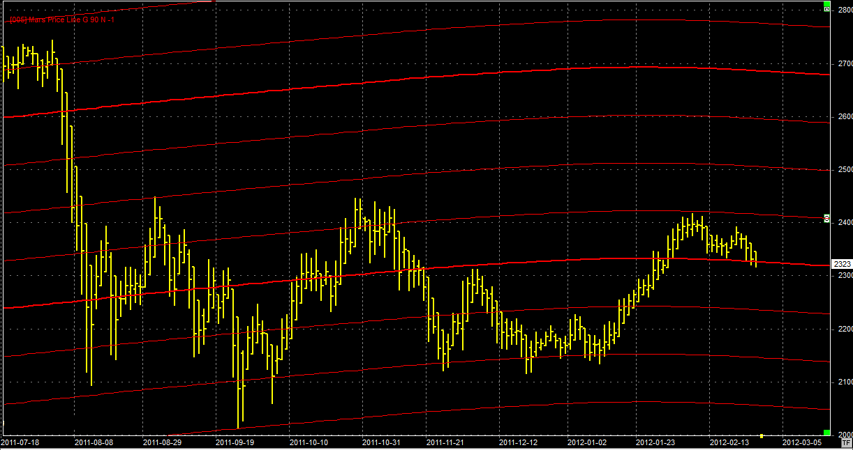 Na wykresie z liniami Marsa widzieliśmy odbicie od wsparcia położonego w okolicach 2330 pkt ale kurs nie zdołał dotrzeć nawet do oporu i zawrócił naruszając na koniec tygodnia ww poziom. Nie wygląda to niestety dobrze gdyż działo się to wszystko przy sprzyjającej atmosferze na innych wiodących rybkach. Tam jednak ruch wzrostowy wydaje się wyczerpywać swój potencjał. Pytanie czy to zintensyfikuje wyprzedaż na GPW czy, tak jaj to miało miejsce wiele razy, zachowamy odwrotną korelację. Szczerze mówiąc nie wiem, ale jeżeli szybko nie powrócimy ponad naruszone wsparcie to podaż może się zintensyfikować. Patrząc na bardzo duży LOP różnica zdań jest ogromna a połowa na pewno się myli. Kluczowy jest więc początek tygodnia. Jeżeli potwierdzimy przełamanie wsparcia to lecimy o co najmniej 2 pietra w dół. Na korzyść byków przemawia struktura spadków, która wygląda na korektę abc (trochę Elliotta;)), ale ruch spadkowy nie może się pogłębić aby zachować "right look" dla abc.