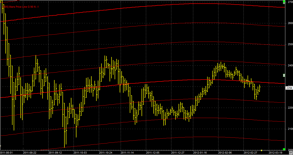 Na wykresie z liniami Marsa dotarliśmy do wsparcia i dobiliśmy. Moim zdaniem nie będzie ono zbyt długie. Najprawdopodobniej dotrzemy do okolic 2300 - 2320 i zawrócimy. Byki zmarnowały swoje szanse dużo wcześniej.