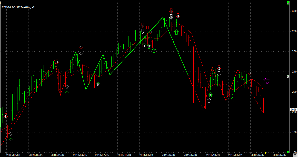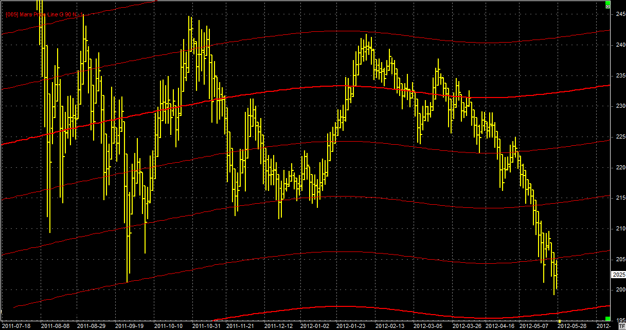 Na wykresie z liniami Marsa widać walkę o linię wsparcia położoną w okolicach 2050 pkt. Nie jest to walka udana. Byki nie były w stanie skontrować ataków niedźwiedzi w taki sposób by chociaż na koniec tygodnia utrzymać się nad nim. Wg mnie walka o to wsparcie jeszcze się będzie toczyć na początku tygodnia ale wynik jej chyba jest skazany na porażkę. Najbliższa linia Marsa poniżej omawianego poziomu znajduje się w okolicach 1970 pkt. Pozytywem jest to, że linie Marsa zaczynają zakręcać ku górze. To daje mniej miejsca na harce niedźwiedzi. Niestety jest to jedyny pozytyw jaki widać na wykresie w obecnej chwili.
