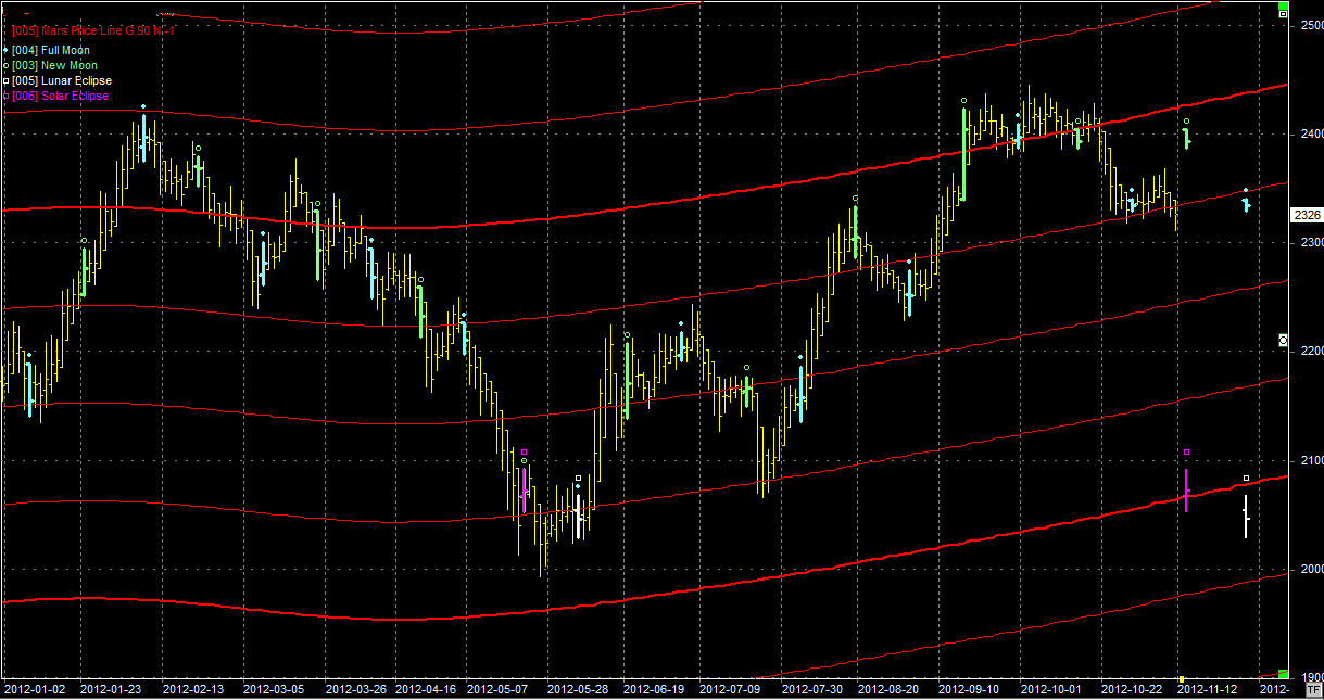 Na wykresie z liniami Marsa mamy lekkie naruszenie wsparcia na linii Marsa położonej obecnie na poziomie 2340 pkt. Jeżeli szybko nad nią nie wrócimy to wg mnie czeka nas spadek przynajmniej do następnej linii położonej w okolicach 2250 pkt. W nadchodzącym tygodniu ciekawym dniem może być 13 listopada, kiedy to na niebie mamy nów połączony z zaćmieniem Słońca.