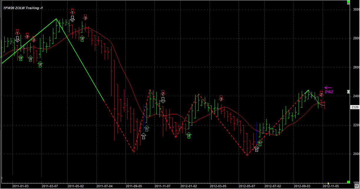 System zajął jedną krótką pozycję (przeciw trendowi) na zamknięciu po 2326 pkt. Stop na 2462 pkt.