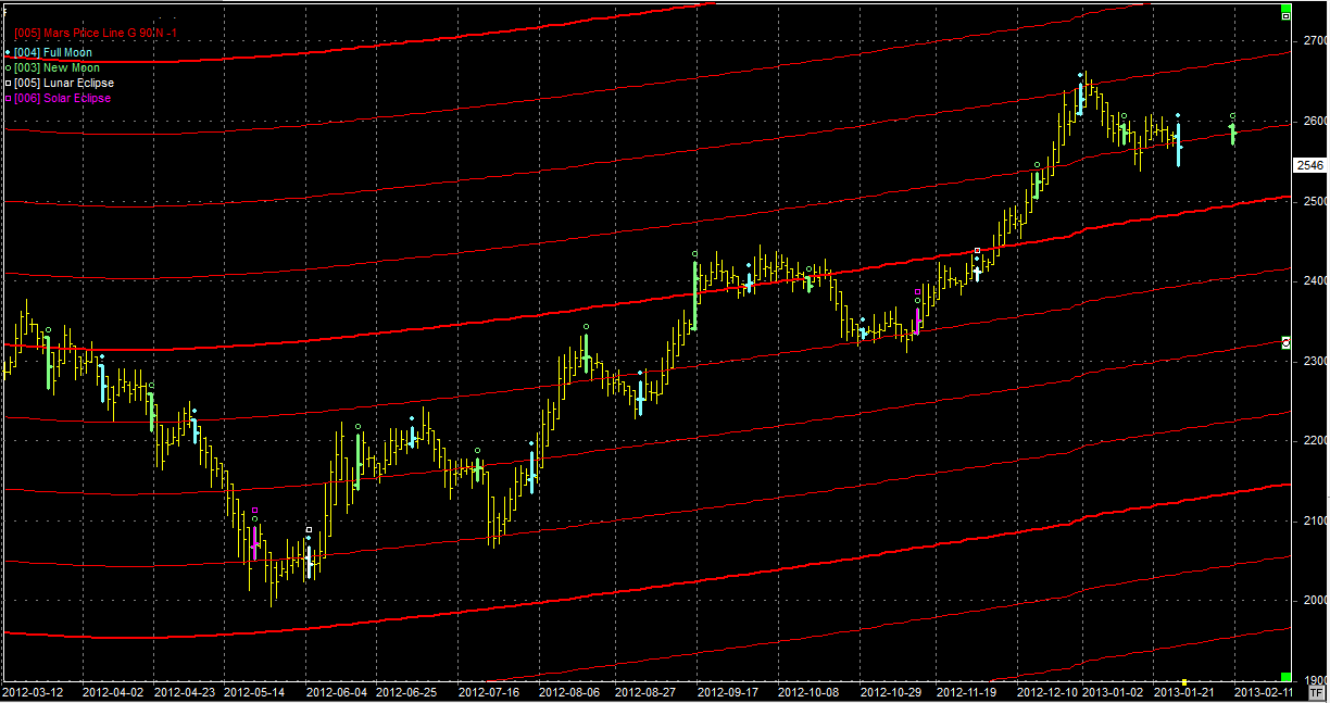 Na wykresie z liniami Marsa walczymy ponownie na wsparciu położonym w okolicach 2550 pkt. Zamknięcie wypadło kapkę niżej więc wynik walki nie jest przesądzony. Trochę nadziei daje pełnia księżyca w poniedziałek 27.01. Może będzie to lokalny dołek u nas? Kłopot w tym, że ta sama pełnia na wiodących rynkach w Europie i za Oceanem może wyznaczyć szczyt. Co wtedy? Cóż możemy spadać pod prąd to możemy i rosnąć. Wg mnie wszystko zależy od utrzymania ww. linii. Jej utrata to spadek do okolic 2500 pkt lub niżej.