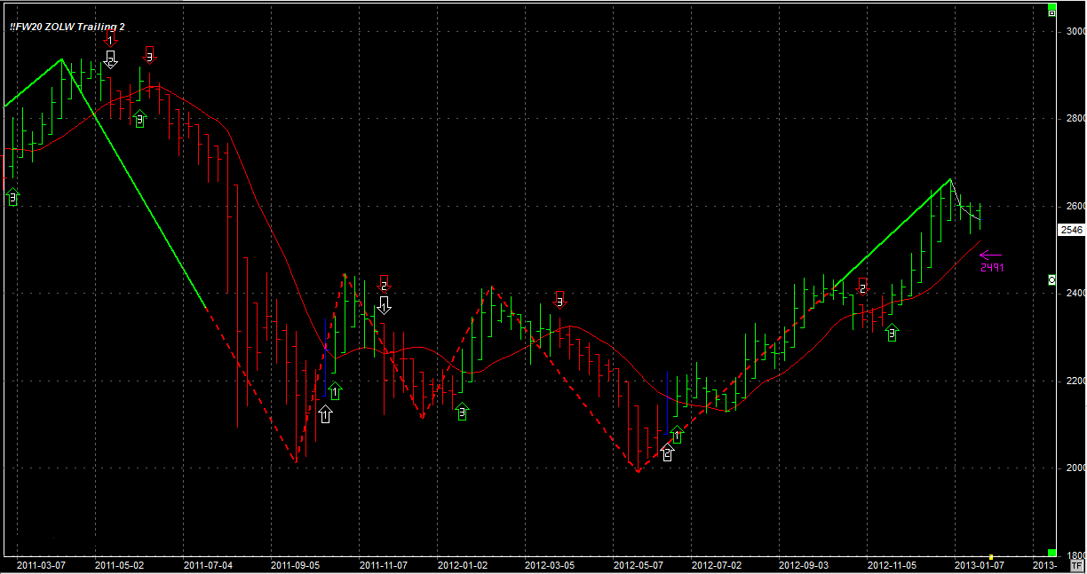 System zajmuje pozycję długą, zgodną z trendem - 2 szt po 2398 pkt. Stop na 2491 pkt