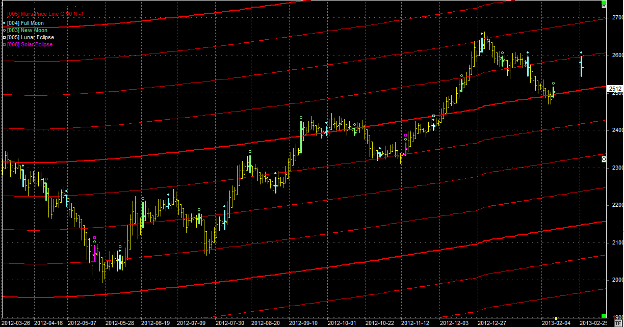 Na wykresie z liniami Marsa widać walkę o wsparcie położone na linii Marsa w okolicach 2500 pkt. Skuteczna obrona tego poziomu będzie implikowała ruch wzrostowy co najmniej w okolice oporu położonego obecnie 2580 pkt. Linie Marsa jednak unoszą się wiec i opór ucieka do góry. To plus dla byków bo mają coraz więcej miejsca na odreagowanie. Z drugiej strony odejście musi nastąpić w miarę szybko, gdyż samo pozostawanie na obecnych poziomach spowoduje utratę wsparcia (też się unosi ku górze). W niedzielę 10.02 mamy Nów.