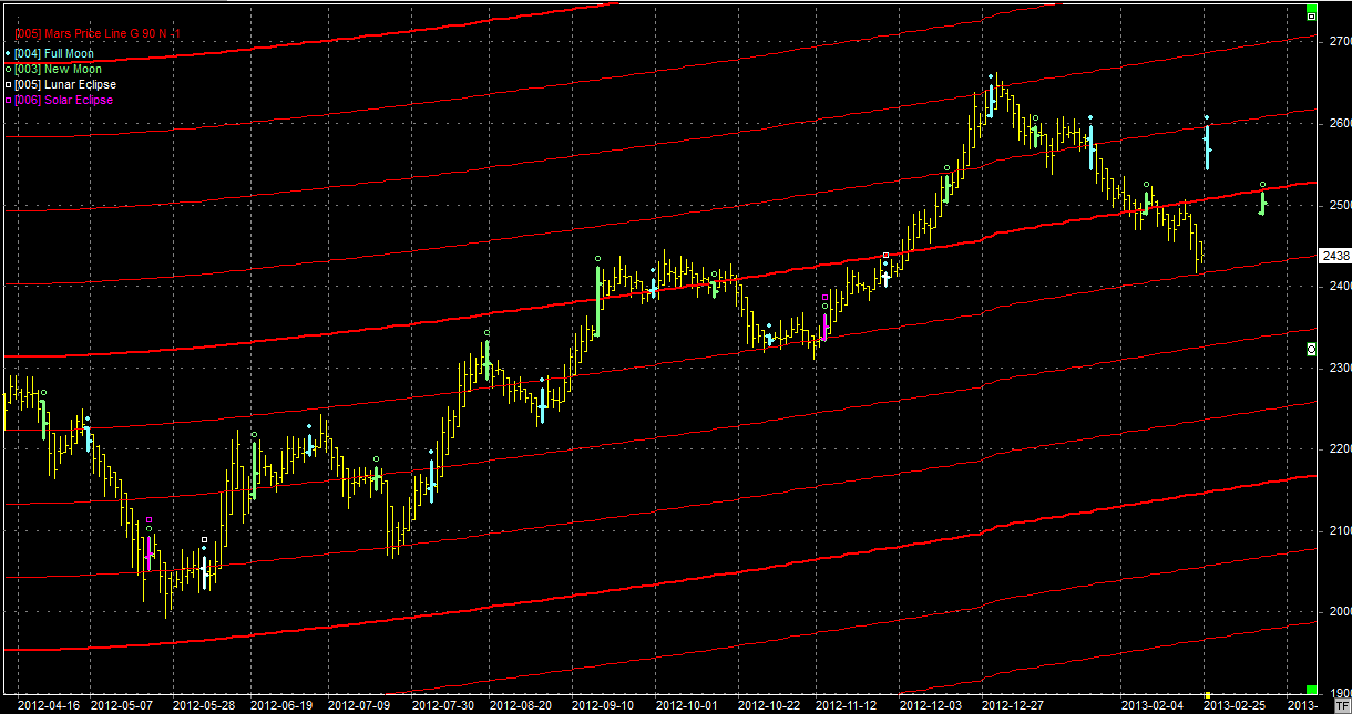 Jeżeli chodzi o wykres z liniami Marsa to w zasadzie można przytoczyć całą zeszłotygodniową analizę by opisać zdarzenia jakie miały miejsce. W skrócie: re-test przełamanego wsparcia, odbicie w dół i zejście do następnego wsparcia w okolicach 2420 pkt. Kurs idealnie przetestował to wsparcie i generujemy odbicie wzrostowe. Trzeba jednak jasno powiedzieć, że jest ono liche w porównaniu do wiodących rynków. Słabość razi podobnie do okresu maj - lipiec 2011, kiedy to nie reagowaliśmy na nowe szczyty na DAX i DJIA. Jaki był rezultat w sierpniu'11 to można sprawdzić na wykresach... Co do przyszłości na wykresie to nadal kluczowym poziomem jest, wg mnie, utracone wsparcie w okolicach 2520 pkt. Jest to teraz opór. Bez pokonania tego poziomu nie ma co marzyć o dalszych wzrostach. Byki o tym wiedzą, więc nie wykluczam w krótkim terminie ponownego testu tego poziomu. Pytanie czy krajowy kapitał się na to zdecyduje. Na zagraniczny nie ma co liczyć na tych poziomach.